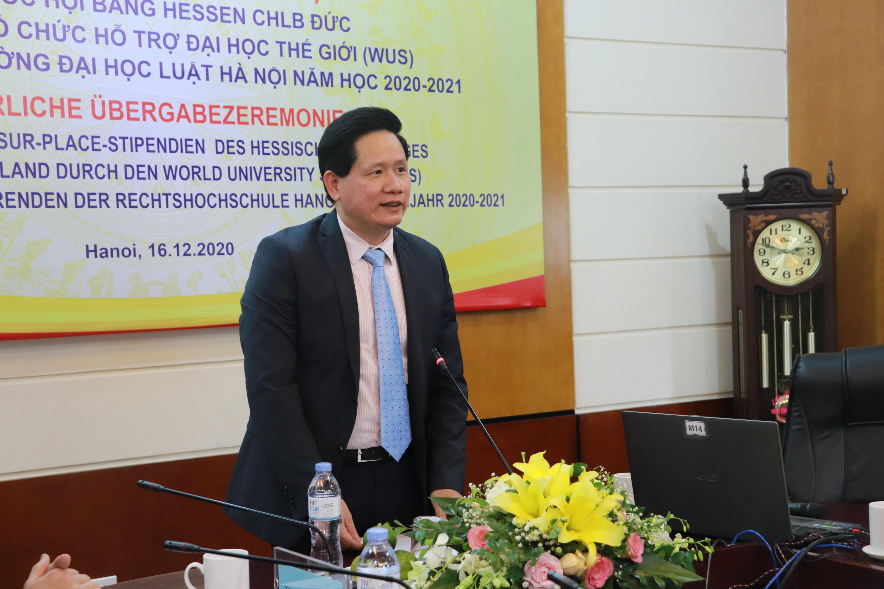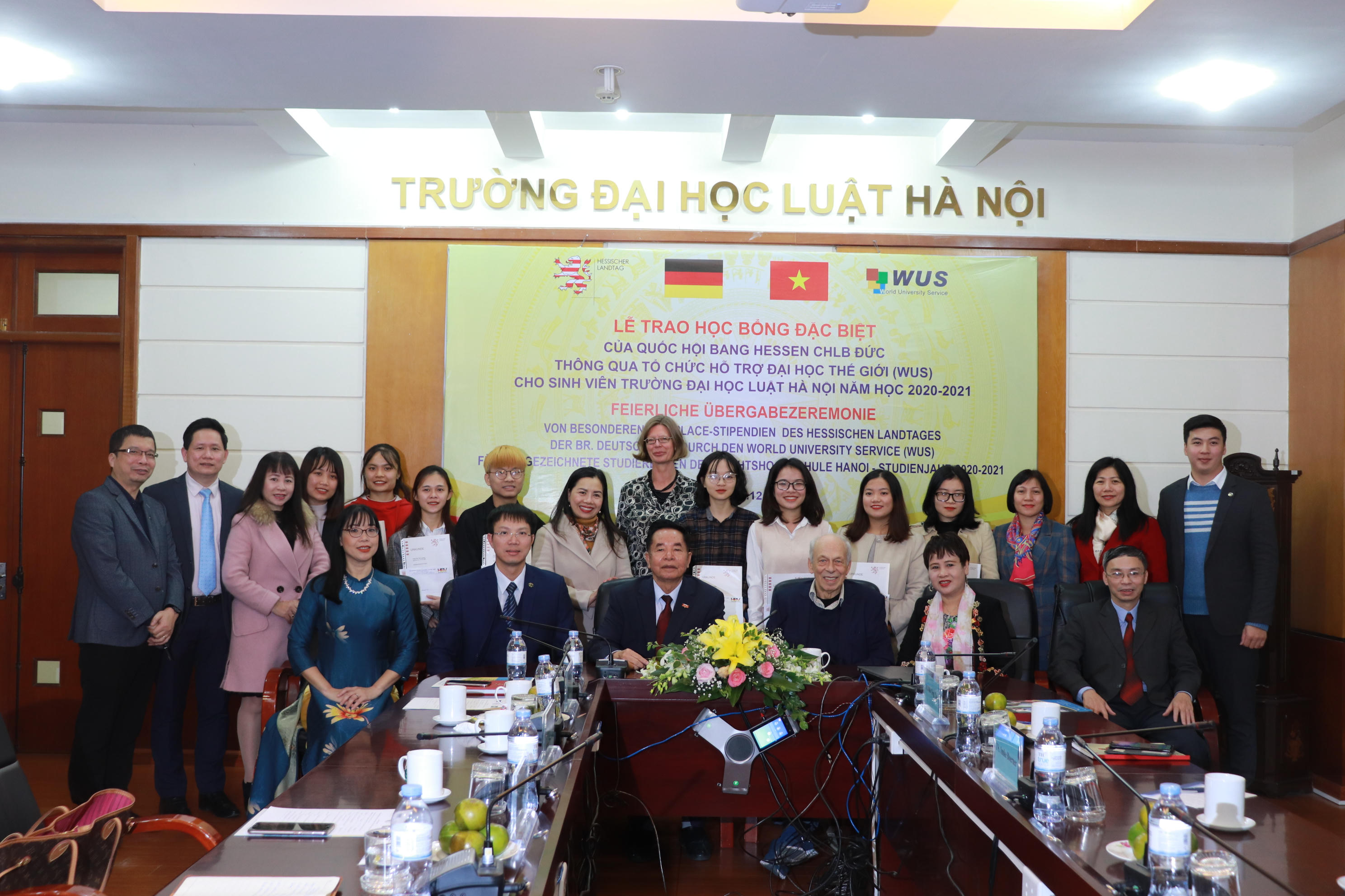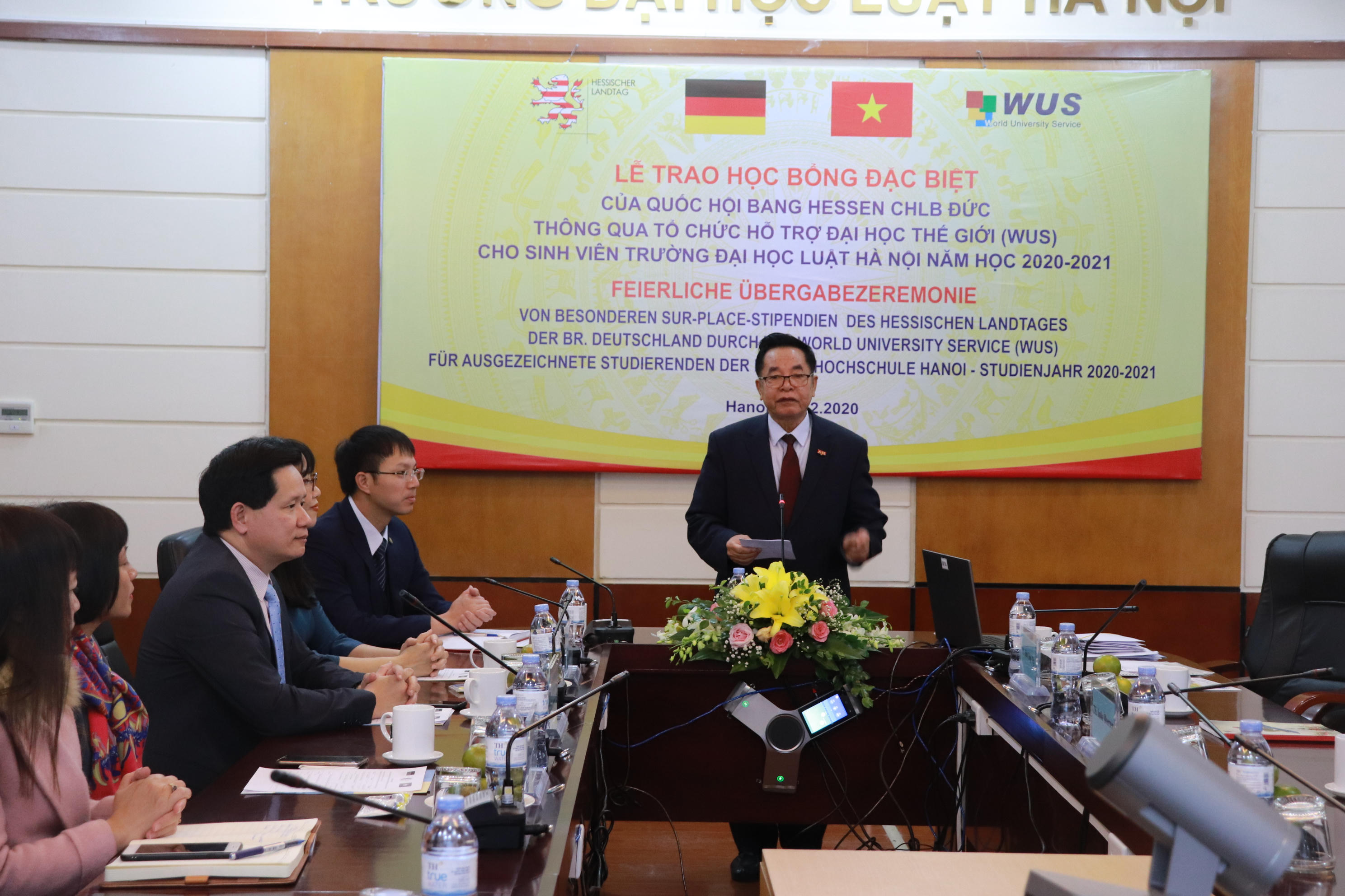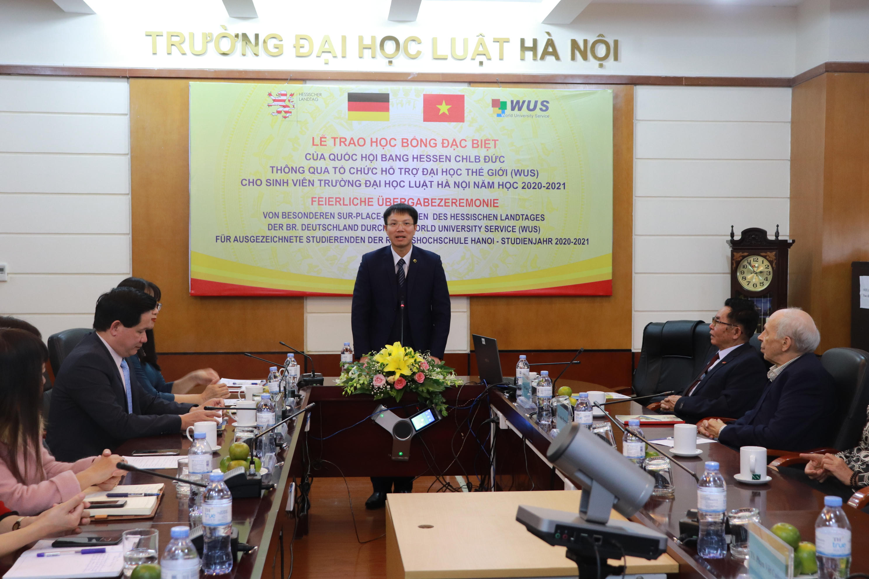 Nhân dịp này, Vụ trưởng Vụ Hợp tác quốc tế Nguyễn Hữu Huyên đã điểm lại một số kết quả hợp tác nổi bật giữa Bộ Tư pháp 2 nước nói chung và giữa Bộ Tư pháp Việt Nam với bang Hessen nói riêng đồng thời gửi lời cảm ơn tới đối tác Đức khi đã tích cực triển khai nhiều hoạt động hiệu quả trong thời gian qua. Ông hy vọng các em sinh viên được nhận học bổng sẽ tiếp tục nỗ lực, phấn đấu để đạt kết quả học tập tốt hơn nữa và Trường ĐH Luật Hà Nội sẽ có thêm nhiều sinh viên có thành tích xuất sắc để đạt được các suất học bổng giá trị của CHLB Đức, có cơ hội được du học tại Đức.