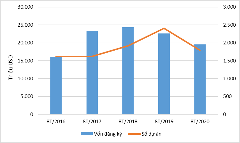 Đối với góp vốn, mua cổ phần, có 4.804 lượt góp vốn, mua cổ phần của nhà ĐTNN, giảm 8,2% so với cùng kỳ, tổng giá trị vốn góp 4,93 tỷ USD, bằng 51,8% so với cùng kỳ. Cơ cấu giá trị góp vốn, mua cổ phần trong tổng vốn đầu tư cũng giảm đáng kể so với cùng kỳ năm 2019, từ gần 42% trong 8 tháng năm 2019 xuống 25,2% trong 8 tháng năm 2020.