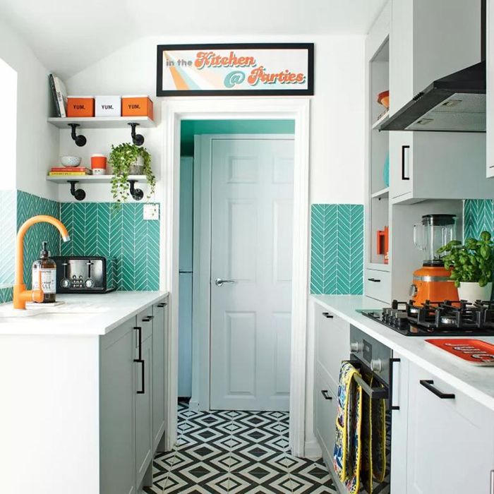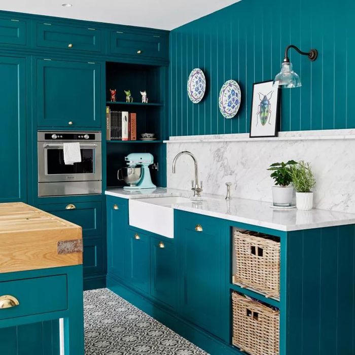1. Màu xanh ngọc lam là một trong những màu sơn được nhiều gia đình dùng để phối màu bếp nhất trong những năm gần đây. Bí quyết để sử dụng gam màu này thành công chính là luôn kết hợp với các gam màu sáng. Bằng cách này, căn bếp của gia đình sẽ trông đầy ấn tượng với những mảng màu xanh ngọc lam tạo điểm nhấn mà vẫn đảm bảo có một không gian sáng sủa cho người dùng.