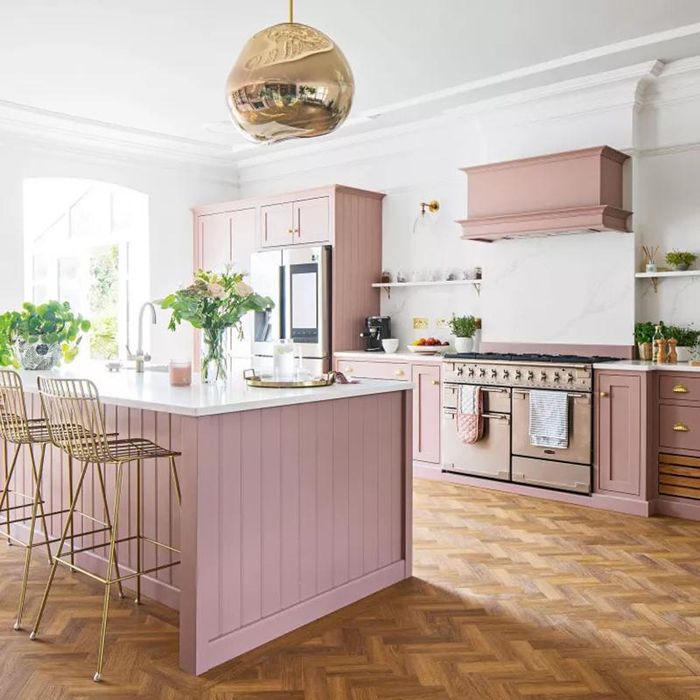 2. Gam màu hồng luôn có một sức hút đặc biệt với các chị em. Để tránh tạo cảm giác sến súa, gam màu hồng xám là gợi ý tốt nhất để dùng phối màu bếp. Đặc biệt, sự kết hợp giữa tông màu hồng và chất liệu đồng luôn tạo ra giá trị thẩm mỹ rất cao cho căn phòng.