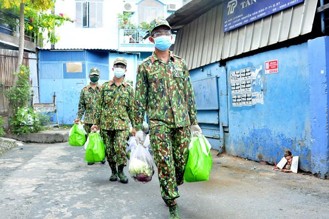 Các chiến sĩ vận chuyển lương thực, thực phẩm đến các khu dân cư trong thời Covid-19. (Ảnh: mattran.org.vn) |