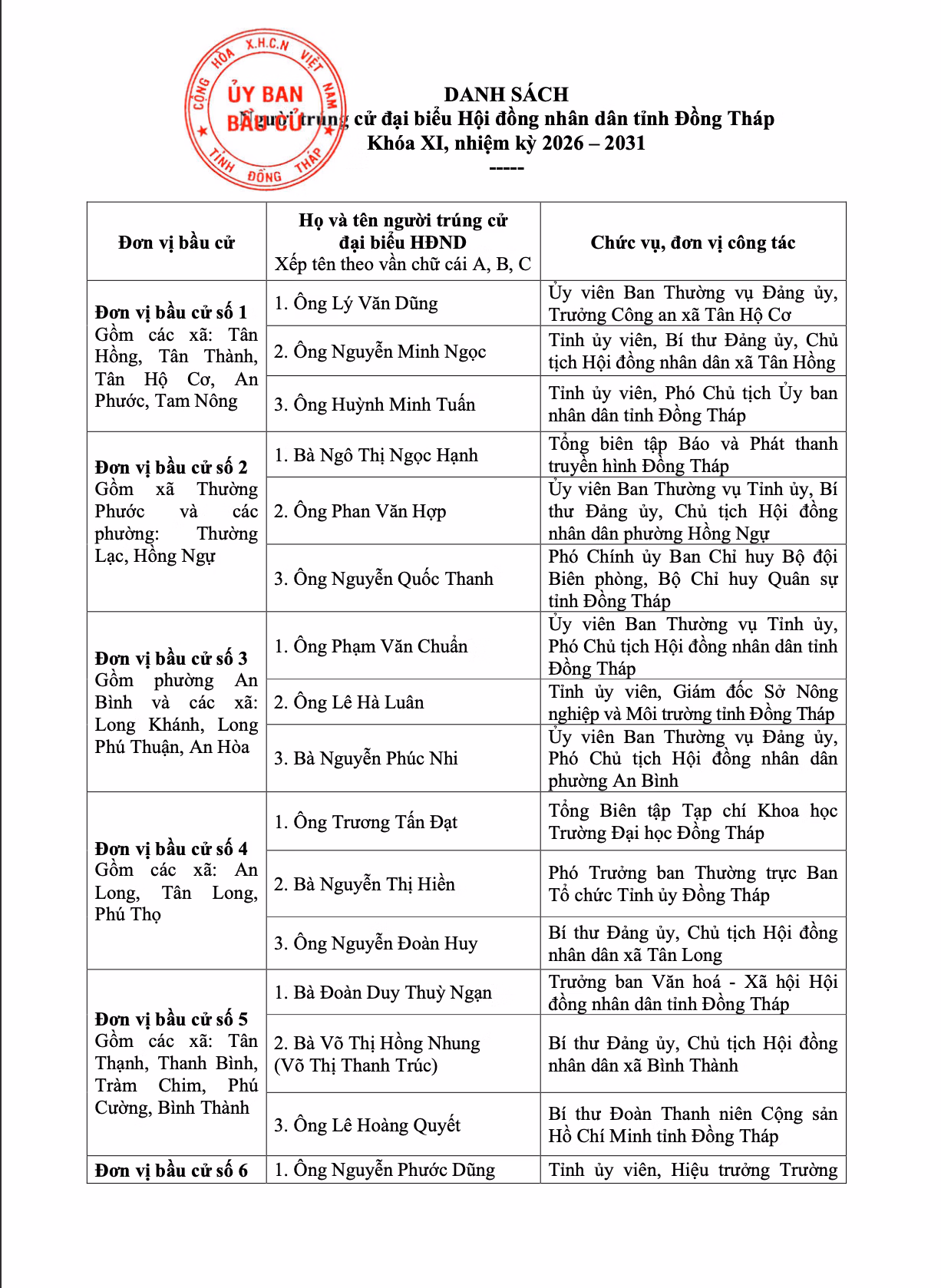 Ngày 20/3, Ủy ban bầu cử tỉnh Đồng Tháp công bố kết quả bầu cử và danh sách người trúng cử đại biểu HĐND tỉnh nhiệm kỳ 2026–2031.