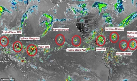 Loạt ảnh vệ tinh nói trên cho thấy Florence - đang tiến gần bờ biển bang Bắc Carolina của Mỹ - chỉ là một trong 9 cơn bão đang di chuyển trên khắp thế giới. bên cạnh đó, bão Helene và bão Isaac cũng đang chuyển động ở Đại Tây Dương trong khi bão 95L đang hướng về vùng Caribbean.