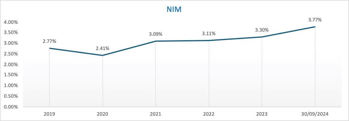 Tỷ lệ NIM lên mức 3,77% so với 3,6% tại cuối quý 2 năm 2024. Ngân hàng dự kiến NIM từ này cho tới hết năm 2024 sẽ duy trì trong khoảng 3,5-3,8%, với việc mặt bằng lãi suất tiếp tục duy trì thấp để hỗ trợ cá nhân và doanh nghiệp trong bối cảnh kinh tế còn nhiều khó khăn.