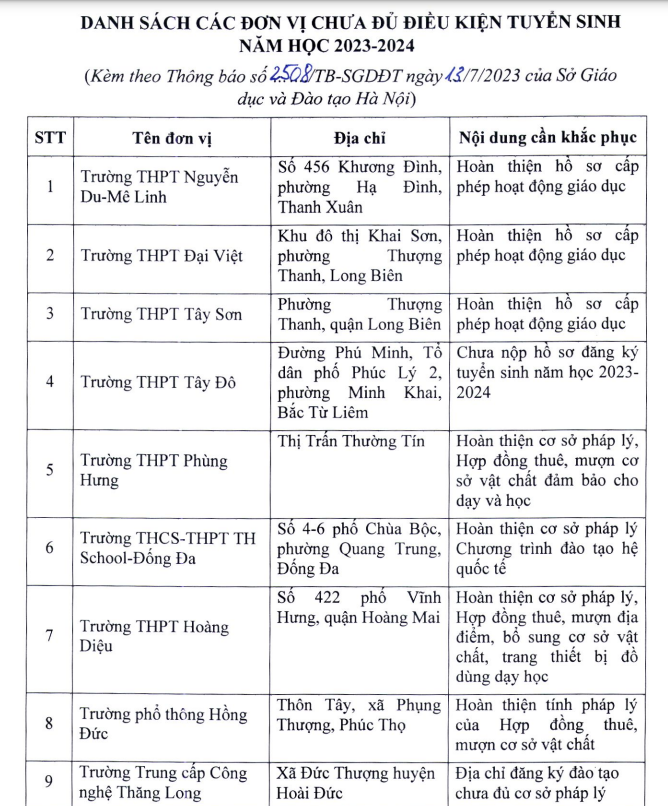 Sở Giáo dục và Đào tạo Hà Nội đề nghị 9 cơ sở giáo dục trên không được phép tuyển sinh vào lớp 10 THPT năm học 2023 - 2024 khi chưa hoàn thiện các điều kiện tuyển sinh theo quy định.
