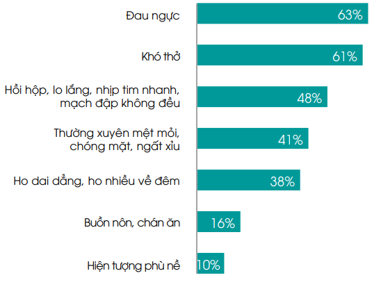 Có 44% người mắc bệnh mạch vành, thiếu máu cơ tim, 37% mắc bệnh suy tim tham gia khảo sát. Trong đó triệu chứng tim mạch thường gặp nhất là đau ngực (63%); khó thở (61%); hồi hộp, lo lắng, nhịp tim nhanh, mạch đập không đều (48%), ngoài ra còn các triệu chứng khác chiếm tỷ lệ ít hơn như mệt mỏi, chóng mặt, ngất xỉu, ho dai dẳng, ho nhiều về đêm, buồn nôn, chán ăn, phù nề…