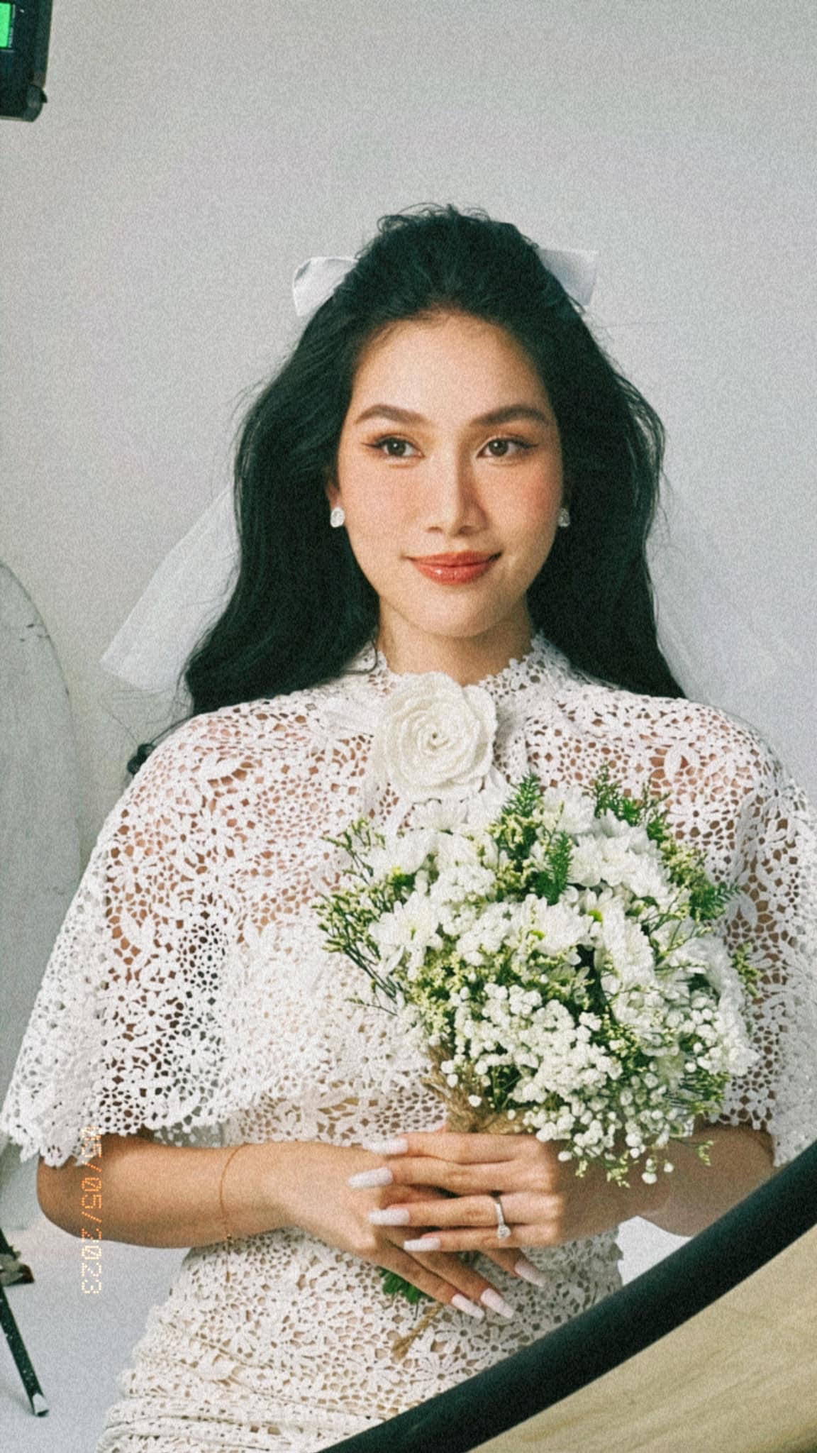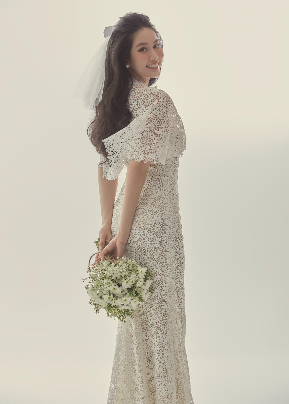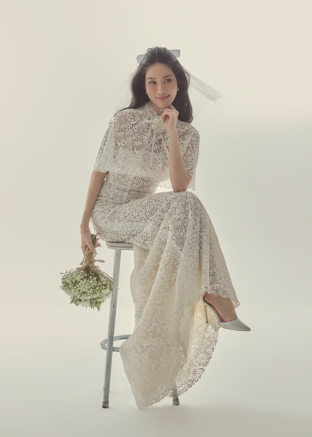 Trong ảnh, cô diện một chiếc váy ren trắng tinh khiết, mang khuynh hướng cổ điển, tinh tế.