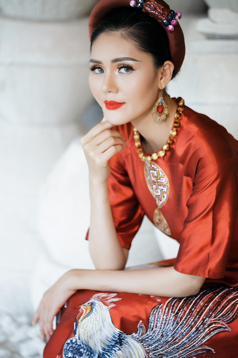 (PLO) -Với chiếc áo dài cách tân độc đáo của NTK Minh Châu được trang trí bởi họa tiết kỳ công cùng những chú gà đậu trên cành đào..., Á hậu Kim Nguyên Á hậu Biển xanh toàn cầu rạng ngời nhưng vẫn giữ được vẻ duyên dáng của người con gái Việt e ấp với tà áo dài trong những ngày đầu Xuân mới.