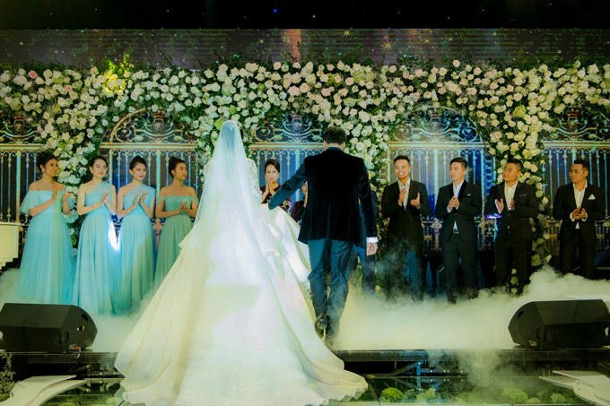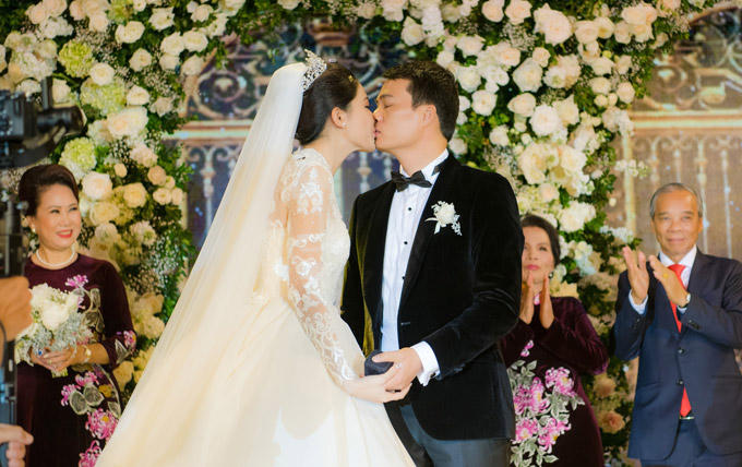 Sau màn trao nhẫn cưới, cô dâu chủ động khóa môi chú rể. Theo dõi các tiết mục ca nhạc trong hôn lễ, cô dâu cũng thể hiện những cử chỉ âu yếm với chồng...