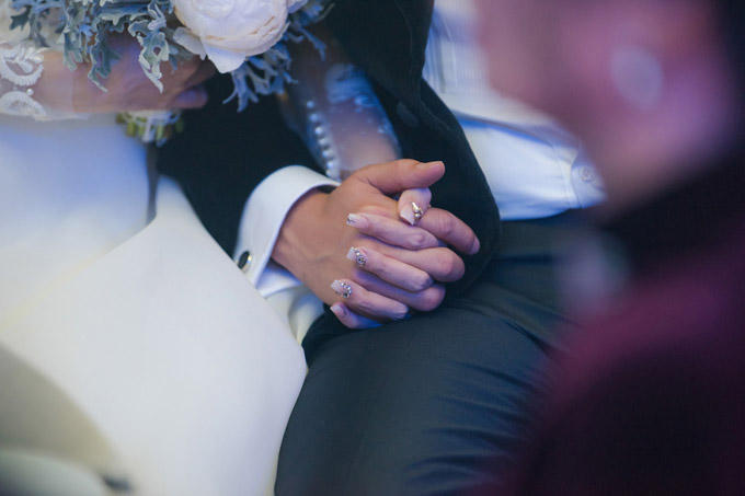 Khi ngồi xuống dự tiệc và theo dõi các tiết mục ca nhạc, cô dâu - chú rể liên tục thể hiện những cử chỉ âu yếm. |