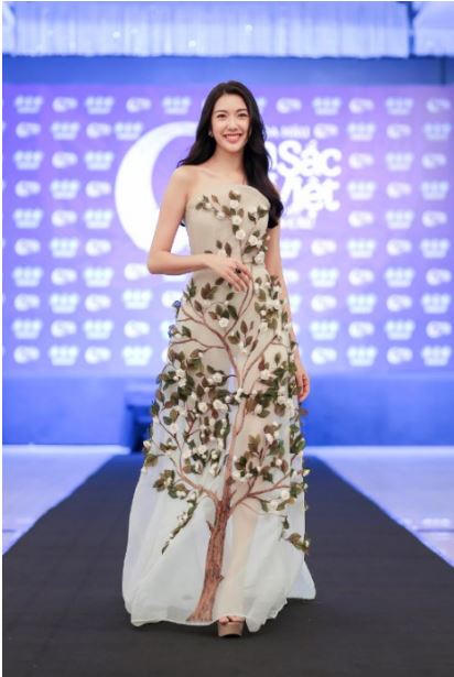 Trước khi bước vào phần thi trình diễn trang phục áo dài và catwalk trong trang phục bikini, Á hậu Thuý Vân đã khiến thí sinh “mắt tròn mắt dẹt” qua màn thị phạm thả dáng chuyên nghiệp. Á hậu tư tin sải những bước chân uyển chuyển trong bộ đầm hoa màu xanh pastel thanh thoát nhẹ nhàng, nhấn nhá bằng chi tiết cúp ngực, khoe khéo bờ vai trần nuột nà.