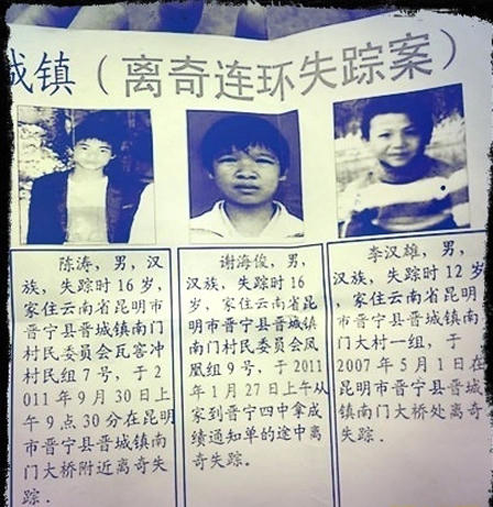 Một trường hợp khác là em học sinh cấp hai Tạ Hải Tuấn. Ngày 27-1-2011, em mất tích trên đường đi học về. Gia đình cho người tìm tại 30 lò gạch rồi in giấy tìm người tốn hơn 1.000 nhân dân tệ (3,38 triệu đồng VN). Thậm chí gia đình tìm bọn xã hội đen ở Côn Minh nhờ tìm con với giá 50.000 nhân dân tệ (169 triệu đồng VN) nhưng cuối cùng vẫn bóng chim tăm cá.