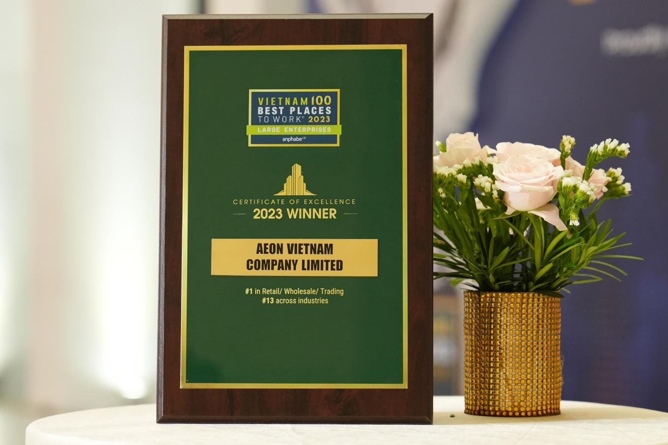 Trong danh sách do Anphabe công bố, AEON Việt Nam được vinh danh tại vị trí 13 trong Top 100 Nơi làm việc tốt nhất Việt Nam 2023 ở tất cả cả ngành nghề và dẫn đầu trong bảng xếp hạng Nơi làm việc tốt nhất ngành bán lẻ/bán sỉ/thương mại. Ngoài ra, AEON Việt Nam tiếp tục vào "Top 50 Nhà tuyển dụng hấp dẫn nhất với sinh viên Việt Nam" ở năm thứ 2 liên tiếp.