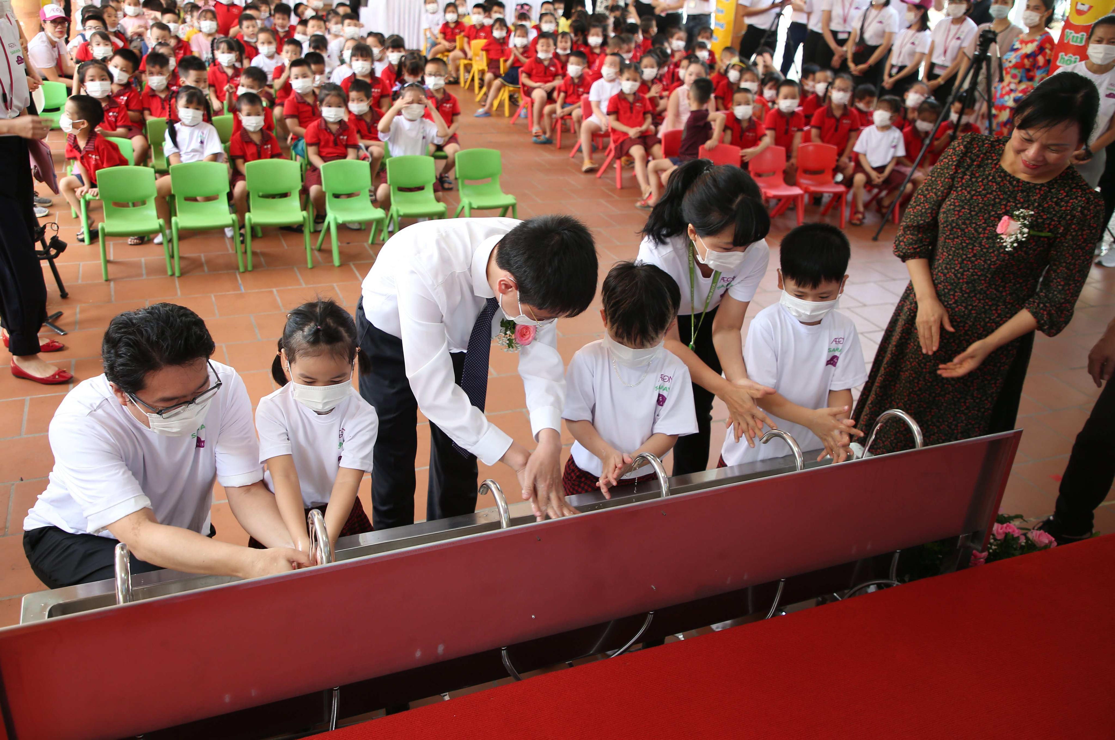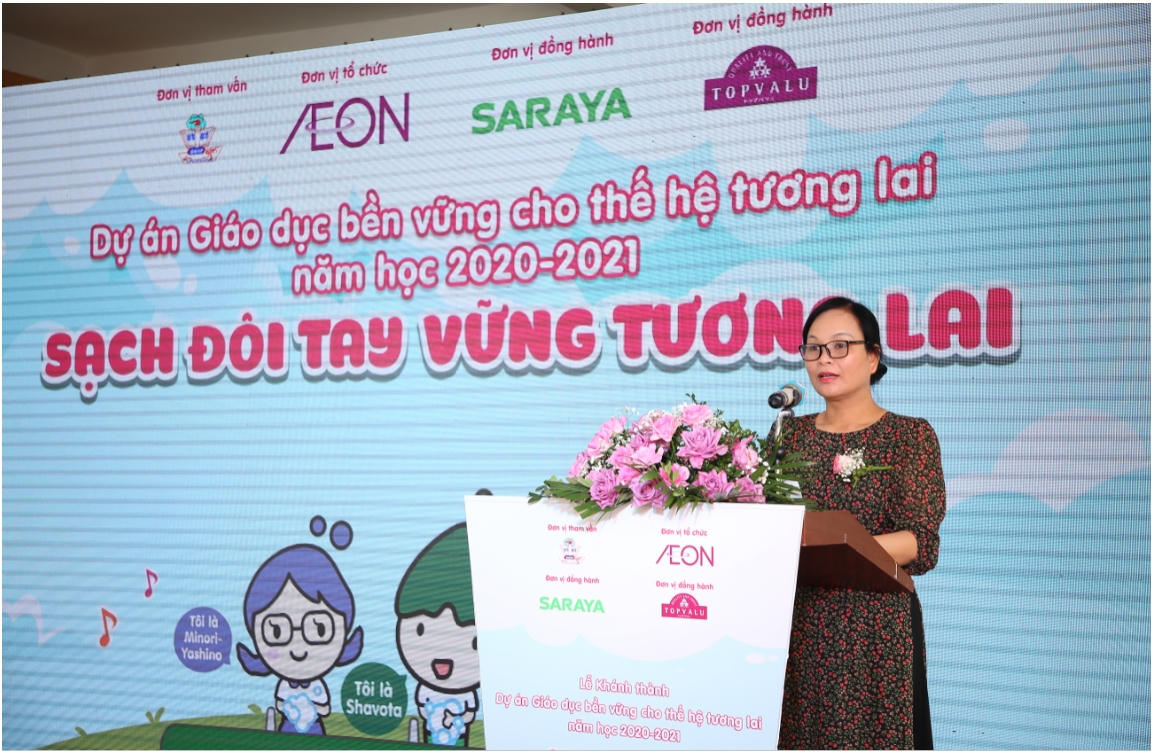 Phát biểu tại buổi lễ, Bà Đỗ Thị Hoà – Phó Giám đốc Sở Giáo dục & Đào tạo Hải Phòng cho biết: “Hoạt động lắp đặt bồn rửa tay với thiết kế đặc biệt và cung cấp nước rửa tay kháng khuẩn của AEON Việt Nam tại Thành phố Hải Phòng sẽ giúp cho các em nhỏ luôn ghi nhớ việc rửa tay cũng như 6 bước rửa tay đúng cách. Dự án Giáo dục bền vững cho thế hệ tương lai thể hiện cam kết của AEON Việt Nam trong việc chung tay cùng cộng đồng địa phương hướng đến một tương lai phát triển bền vững hơn. Thay mặt Ban Giám đốc Sở Giáo dục & Đào tạo, chúng tôi đề nghị các thầy cô giáo trong Ban giám hiệu phối hợp để quản lý và hướng dẫn học sinh thực hiện Dự án một cách hiệu quả.”