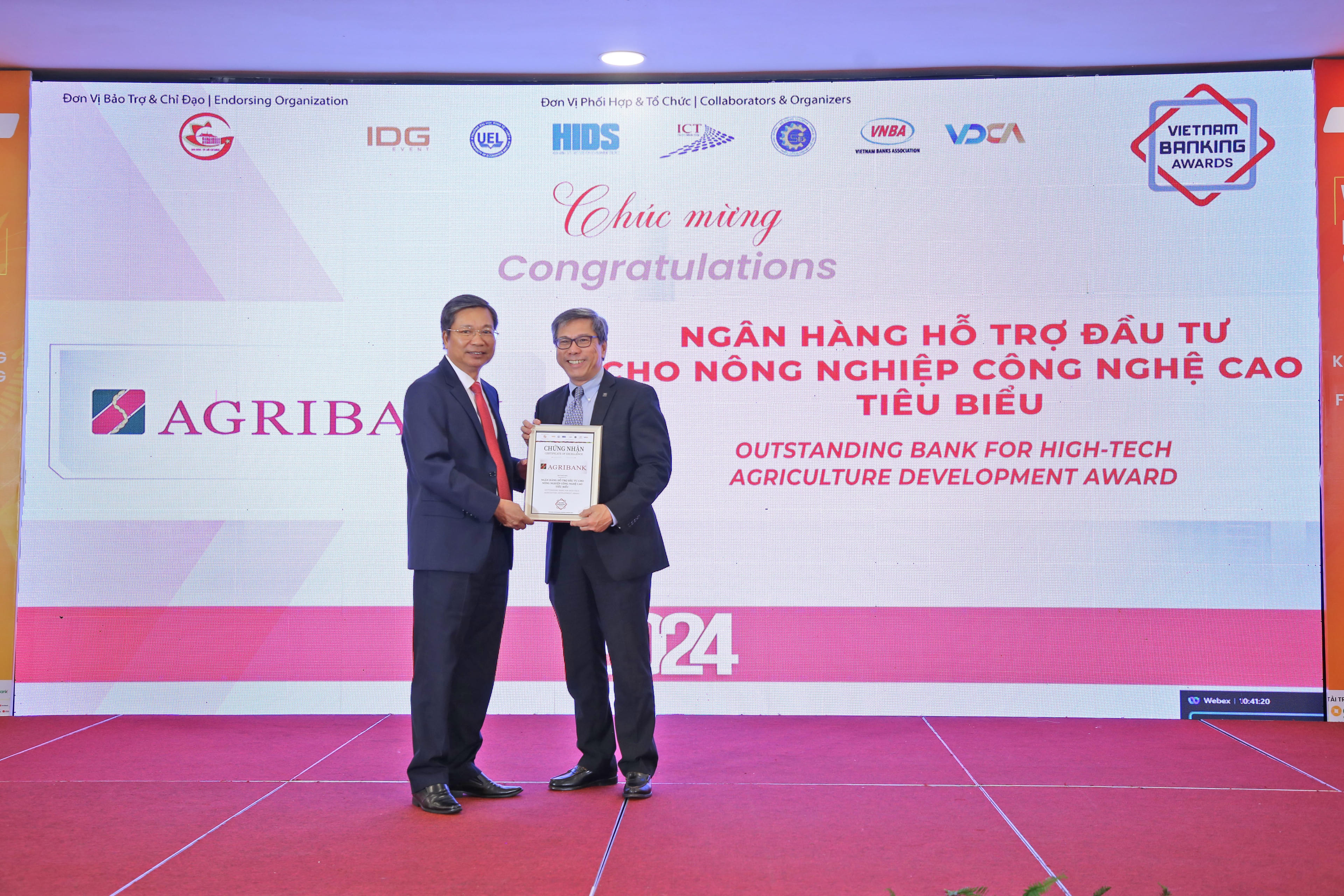 Ông Phạm Gia Khương - Phó Trưởng Văn phòng Đại diện khu vực miền Nam (bên trái) đại diện Agribank nhận danh hiệu “Ngân hàng hỗ trợ đầu tư cho nông nghiệp công nghệ cao tiêu biểu” 2024. |