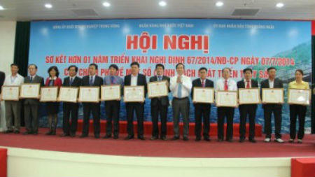 Với những kết quả đã đạt được, Agribank và Agribank Chi nhánh Bình Thuận cùng Cty CP Thủy sản Lý Sơn – khách hàng của Agribank – nằm trong số 10 tập thể, cá nhân được Thống đốc Ngân hàng Nhà nước trao tặng Bằng khen (ảnh) do có thành tích xuất sắc trong việc triển khai thực hiện NĐ 67.