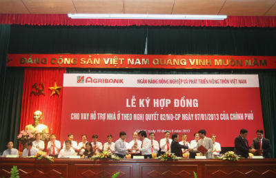 Sáng 10/6, tại Hà Nội, Agribank tổ chức ký kết thỏa thuận nguyên tắc tài trợ dự án với 10 DN đầu tiên, tiên phong triển khai chương trình cho vay hỗ trợ nhà của Agribank từ nguồn tái cấp vốn của NHNN theo Thông tư số 11/2013/TT-NHNN ngày 15/5/2013 của NHNN quy định về cho vay hỗ trợ nhà ở theo Nghị quyết số 02/NQ-CP ngày 7/1/2013 của Chính phủ, Thông tư số 07/2013/TT-BXD ngày 15/5/2013 của Bộ Xây dựng.
