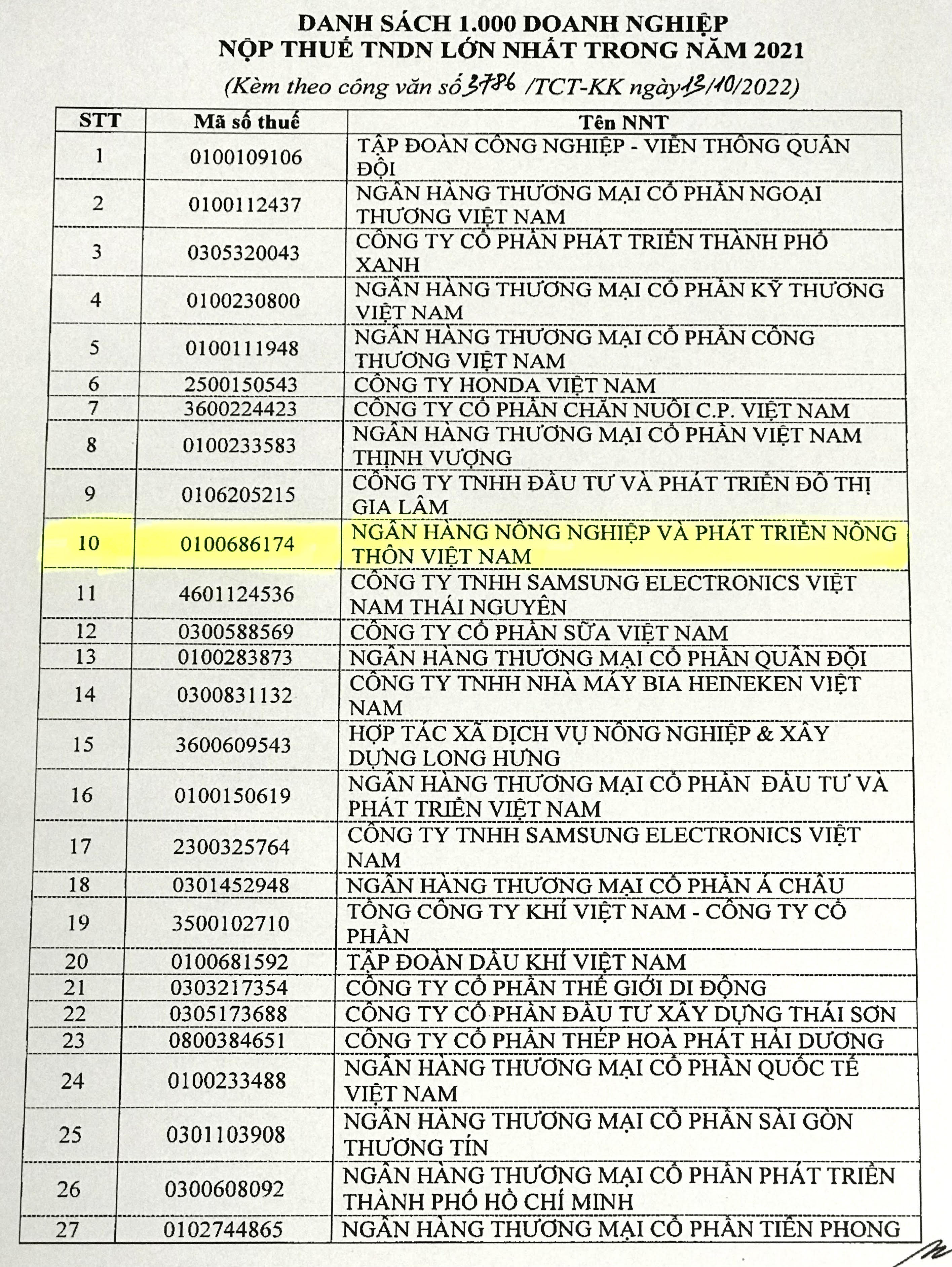 Agribank - TOP 10 Doanh nghiệp nộp thuế lớn nhất Việt Nam năm 2021