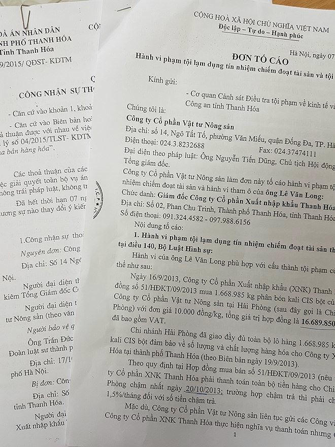 Theo Quyết định công nhận sự thỏa thuận của các đương sự số 09/2015/QĐST-KDTM ngày 22/5/2015 của TAND thành phố Thanh Hóa, thì Công ty Cổ phần Xuất nhập khẩu Thanh Hóa phải trả cho Công ty Vật tư Nông sản (Apromaco) số tiền trên 20 tỷ đồng và lãi suất chậm thi hành án.