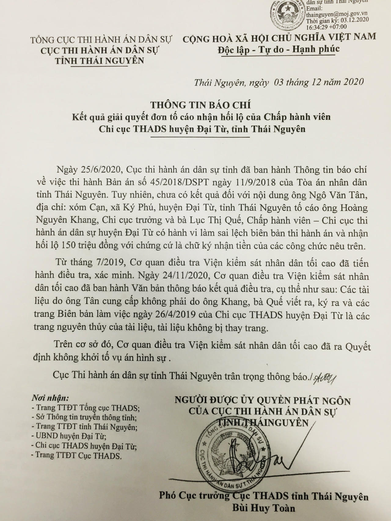 Sau một năm rưỡi tiến hành xác minh cặn kẽ, ngày 24/11/2020, Cơ quan Điều tra, Viện Kiểm sát nhân dân tối cao đã ra Quyết định không khởi tố vụ án hình sự đối với vụ việc ông Ngô Văn Tân tố cáo Chi cục trưởng THADS Đại Từ Hoàng Nguyên Khang.