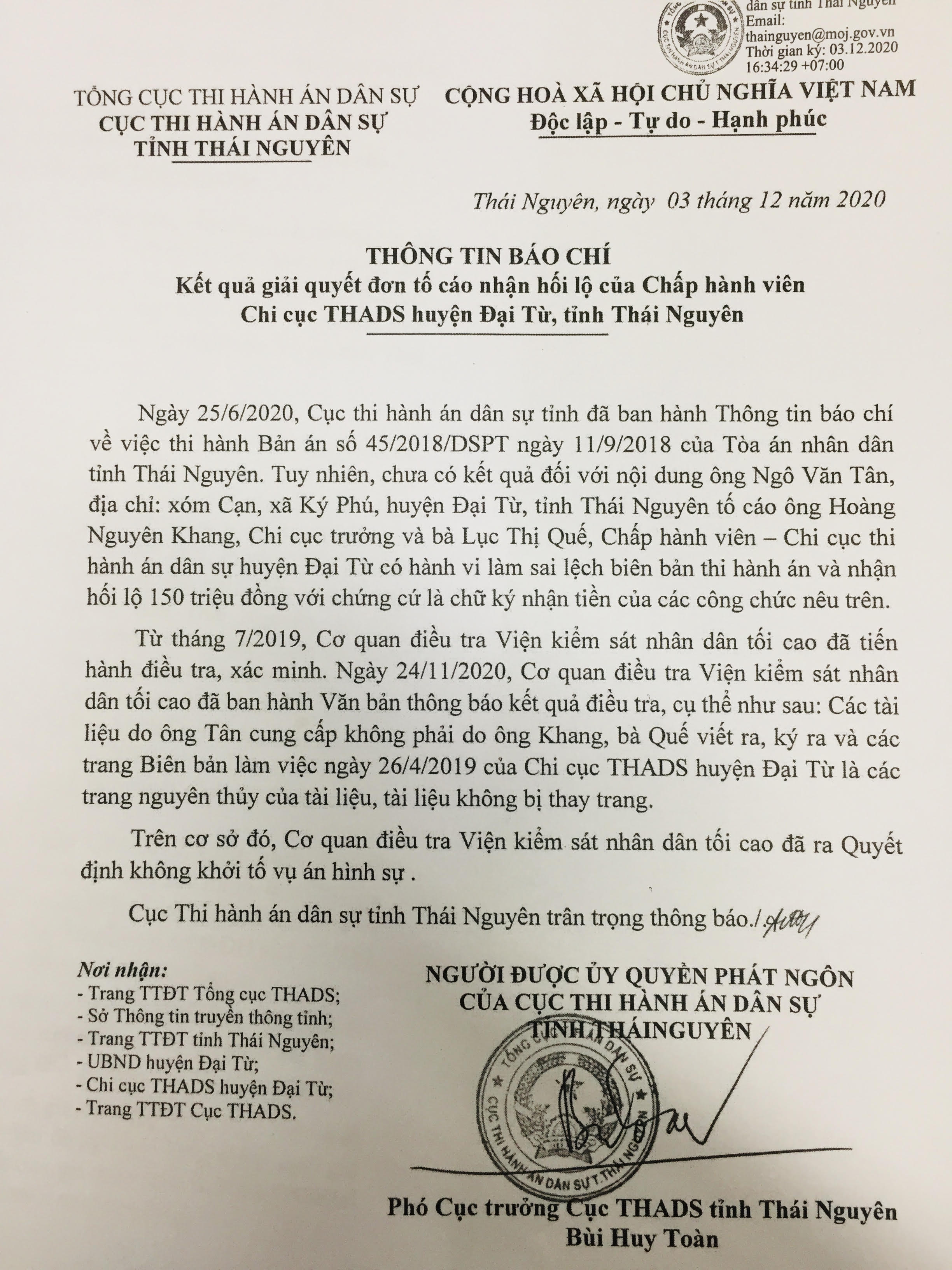 Kết quả, cả Viện Khoa học Hình sự, Bộ Công an và Phòng Giám định kỹ thuật hình sự, Bộ Quốc phòng đều khẳng định các tài liệu do ông Tân cung cấp có nội dung về việc ông Khang, bà Quế nhận tiền, hẹn trả tiền và đề nghị ông Tân rút đơn tố cáo “là không phải do ông Khang, bà Quế viết ra, ký ra”. Biên bản làm việc ngày 26/4/2019 của Chi cục THADS Đại Từ mà ông Tân tố cáo bị làm sai lệch “là các trang nguyên thủy của tài liệu và không bị thay trang”. Do đó, xác định không có việc ông Khang, bà Quế có hành vi nhận hối lộ và làm sai lệch biên bản thi hành án như tố cáo của ông Tân.