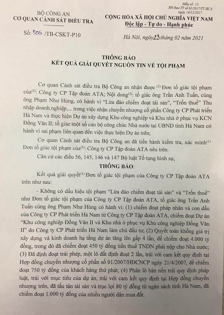 Qua quá trình điều tra, xác minh theo đơn tố giác của ông Phạm Văn Ảnh, ngày 23/02/2021, Cơ quan cảnh sát điều tra Bộ Công an (C03) đã phát hành Thông báo số 506/TB-CSKT-P10 trả lời cho ông Ảnh và Công ty CP Tập đoàn ATA biết tất cả các nội dung tố giác của ông Ảnh là không có căn cứ.