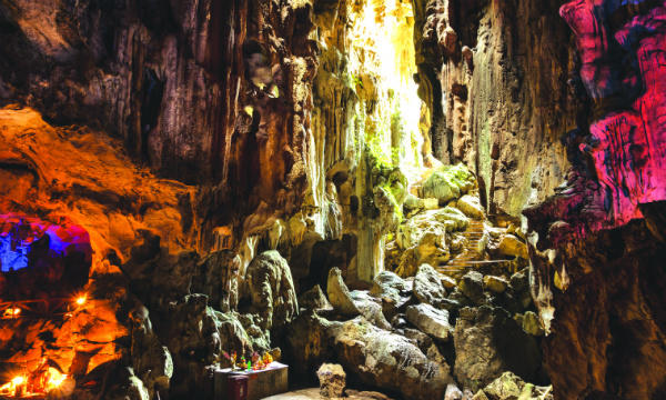 Hang động Tam Thanh ở lưng chừng núi. Cửa hang nhìn về hướng đông cao chừng 8m có lối lên là 30 bậc đá đục vào sườn núi, có nhiều cây cối um tùm che khuất ánh nắng. Trong động có hồ Cảnh, nước luôn trong xanh. Chiều dài lòng động khoảng 50m với nhiều nhũ đá tạo những hình thù đẹp mắt, hấp dẫn du khách. Phía sau động, có cửa Thông Thiên thông lên đỉnh núi. Bia Tam Thanh ghi: “Động này là kỳ quan do trời đất tạo ra, nơi đây là thắng cảnh của vùng đất thiêng người giỏi, thật khó mà miêu tẢ, tô vẽ được”.