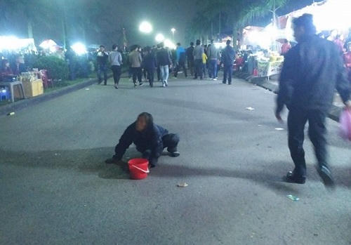 | Một người phụ nữ bị cụt mất một chân lê lết kéo theo chiếc rổ xin tiền du khách đi dự lễ khai ấn đền Trần. |