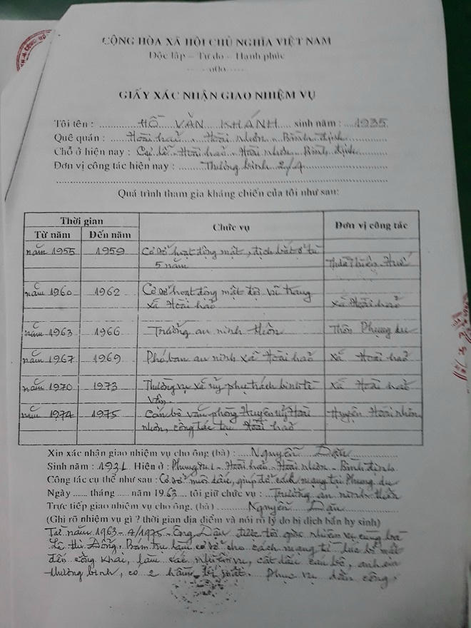 Theo trình bày của ông Khánh (thương binh ở xã Hoài Hảo), chữ ký trong Giấy xác nhận giao nhiệm vụ ngày 7/8/2011 cho ông Dậu là chữ ký của ông. Tuy nhiên, ông không biết ông Dậu là ai. Thời điểm ấy, khi có chủ trương làm hồ sơ khen thưởng kháng chiến đợt cuối, có người đến nhờ ông ký khống vào một số tờ giấy xác nhận làm khen thưởng nhưng không ghi nội dung xác nhận. Sau đó, họ ghi nội dung gì và cho ai thì ông không hề biết. Ông Khánh xin rút lại chữ ký, nội dung và Giấy xác nhận giao nhiệm vụ ngày 7/8/2011.