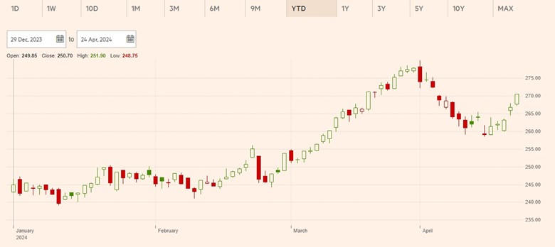 Giá cổ phiếu hiện ở mức 270,5 EUR, tăng 1,42% so với phiên giao dịch trước đó.