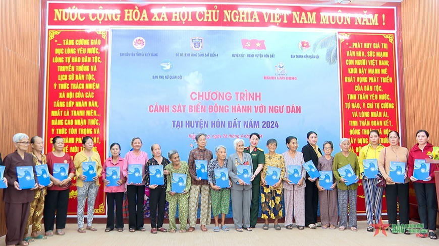 (PLVN) - Nhằm góp phần nâng cao nhận thức, trách nhiệm của Nhân dân đối với nhiệm vụ quản lý, bảo vệ chủ quyền biển, đảo và tăng cường các hoạt động đoàn kết, gắn bó quân dân, từ ngày 26 - 27/4, Bộ Tư lệnh (BTL) Vùng Cảnh sát biển 4 triển khai nhiều hoạt động ý nghĩa trong Chương trình “Cảnh sát biển đồng hành với ngư dân” tại huyện Hòn Đất, tỉnh Kiên Giang.