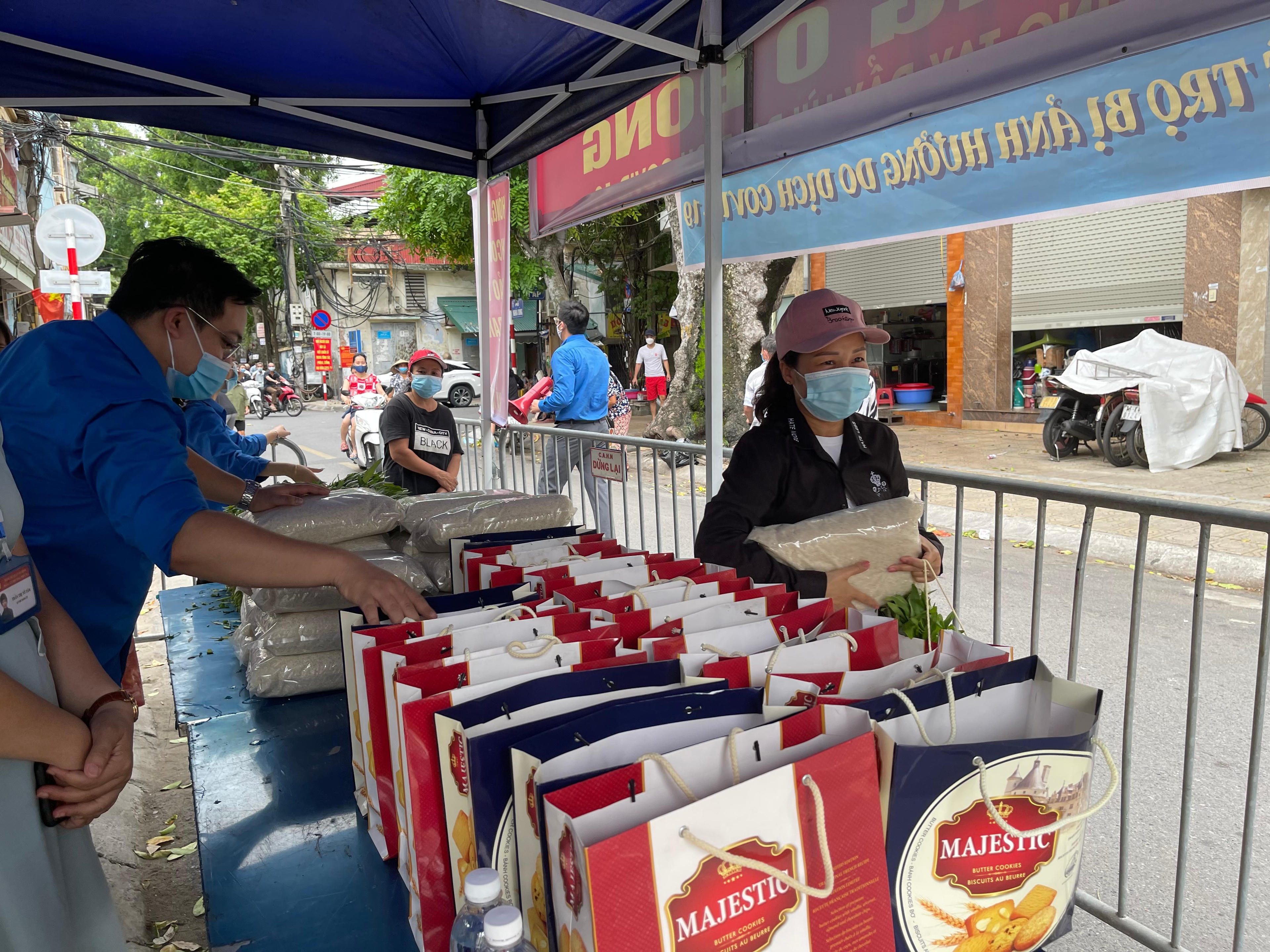 Những túi gaọ, mớ rau xanh được trao tận tay người lao động mất việc trong thời gian Hà Nội thực hiện giãn cách xã hội tại phường Phúc Xá (Ảnh: Mỵ Châu) |
