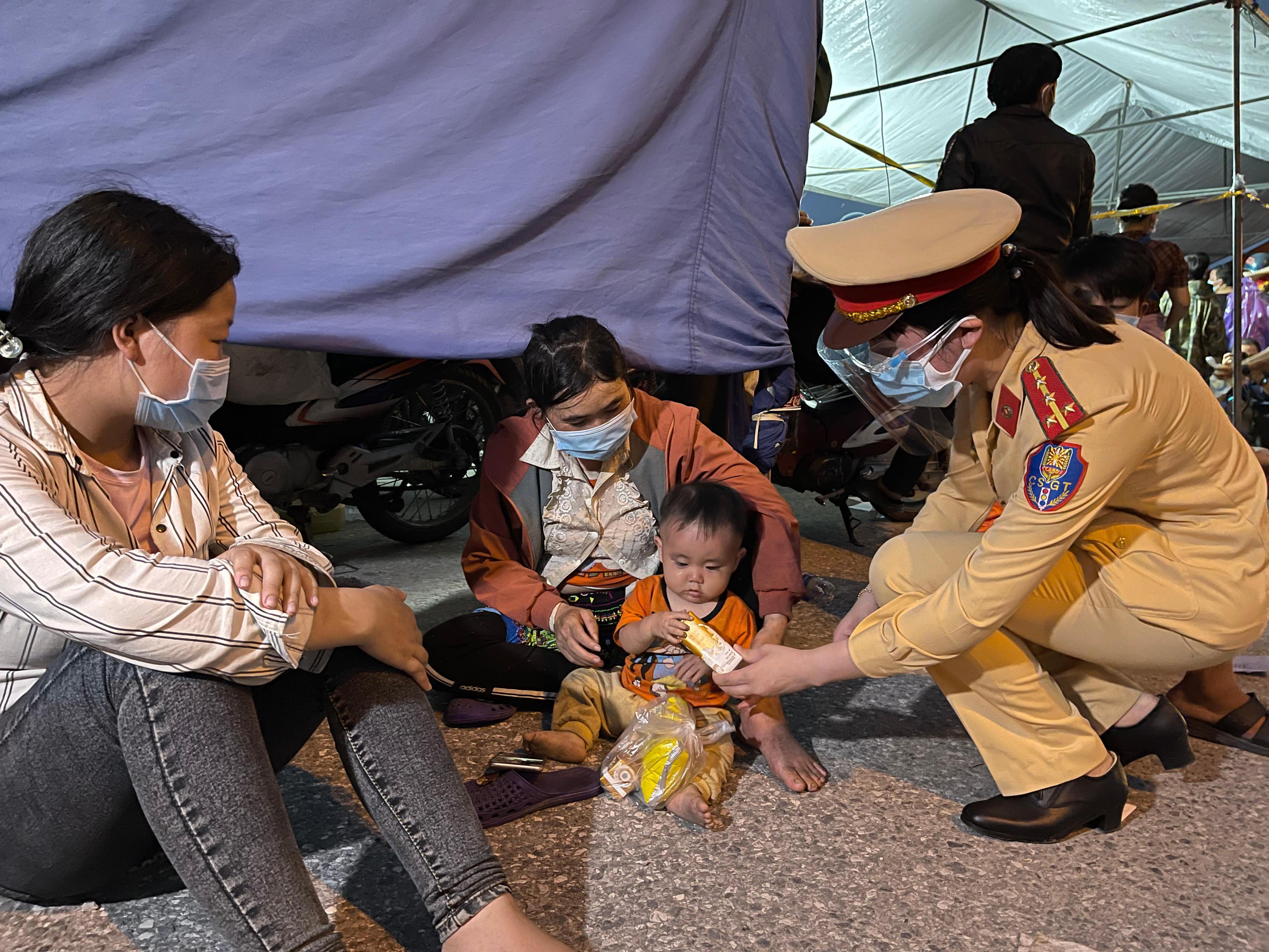 "Trên đường người dân di chuyển, có những trường hợp phương tiện bị hỏng nên chúng tôi cử người đi theo để hỗ trợ, phối hợp với quân đội điều xe buýt giúp người dân. Trường hợp khác sẽ được hỗ trợ mua xăng. Phòng CSGT Thành phố, Thành đoàn, Chủ tịch UBND các địa bàn cũng đến tặng bà con bánh mì, sữa, nước...", Trung tá Bùi Ngọc Anh cho biết thêm.