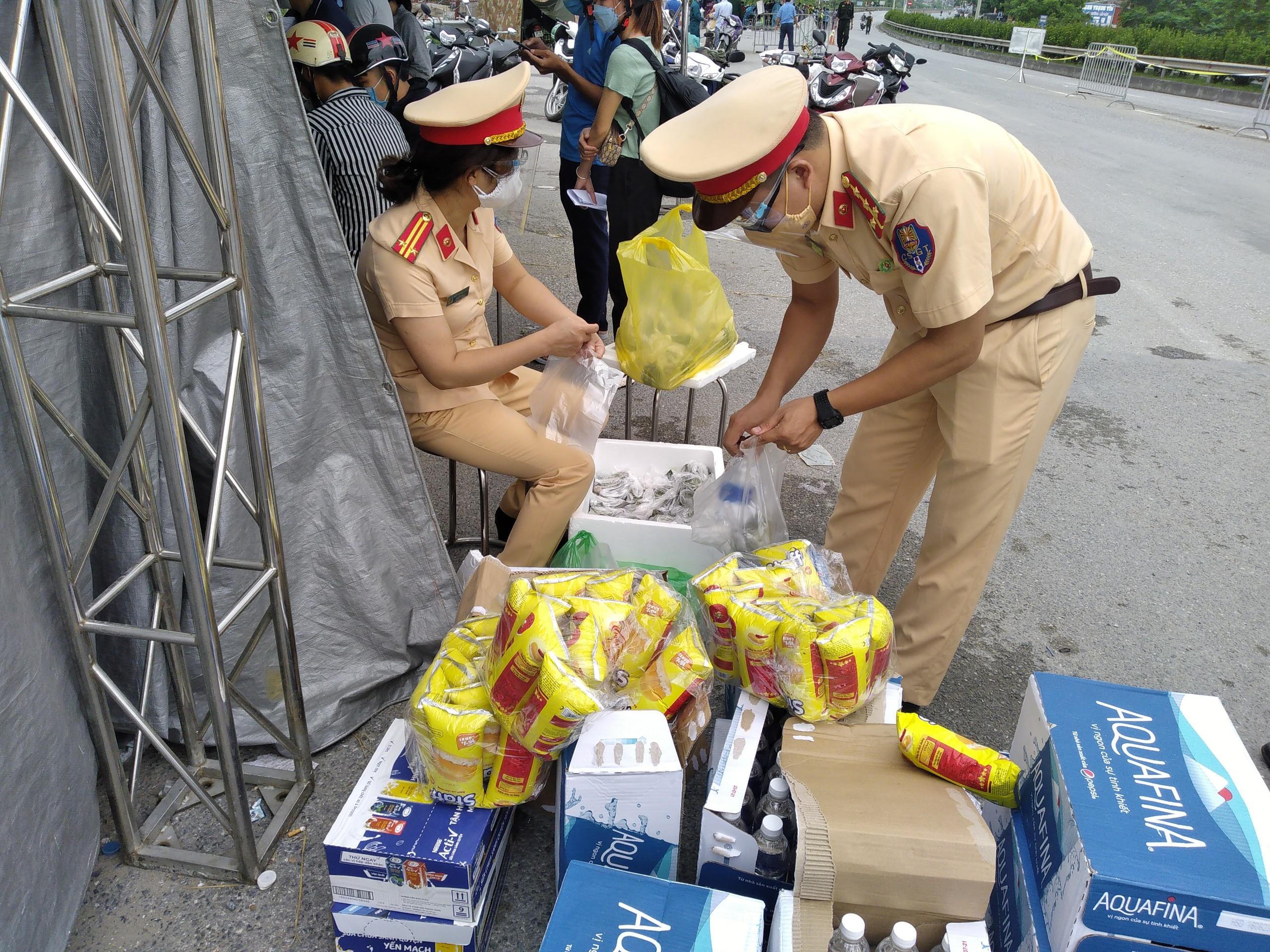 Khi đi qua chốt, người dân được lực lượng CSGT thuộc Phòng CSGT đường bộ-đường sắt, công an TP Hà Nội tặng miễn phí mỗi người một suất quà gồm sữa, bánh mì, bánh khúc... và nước.