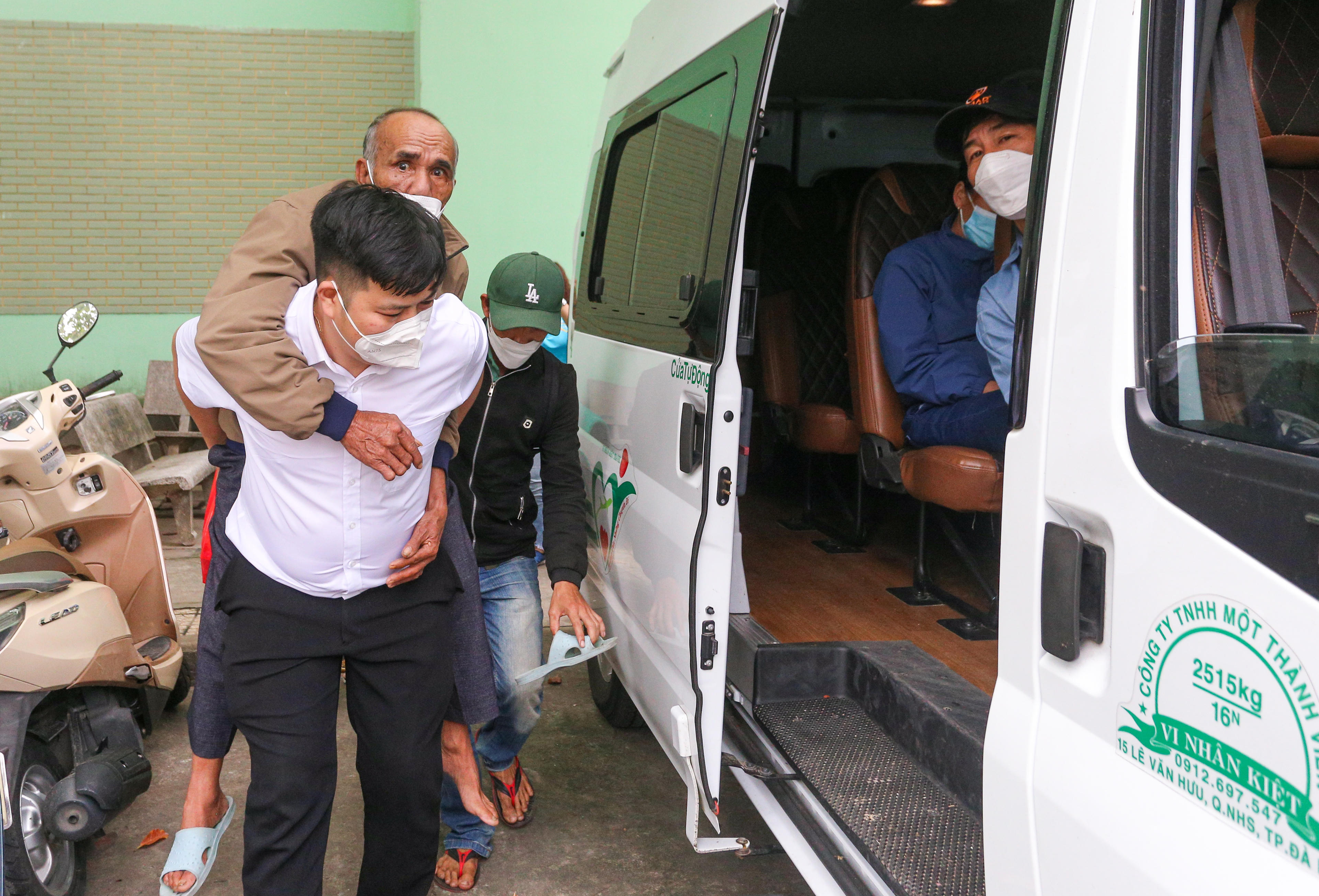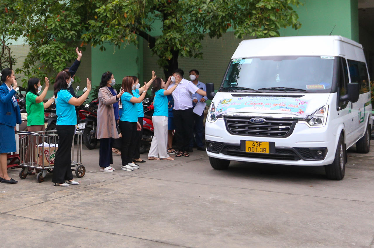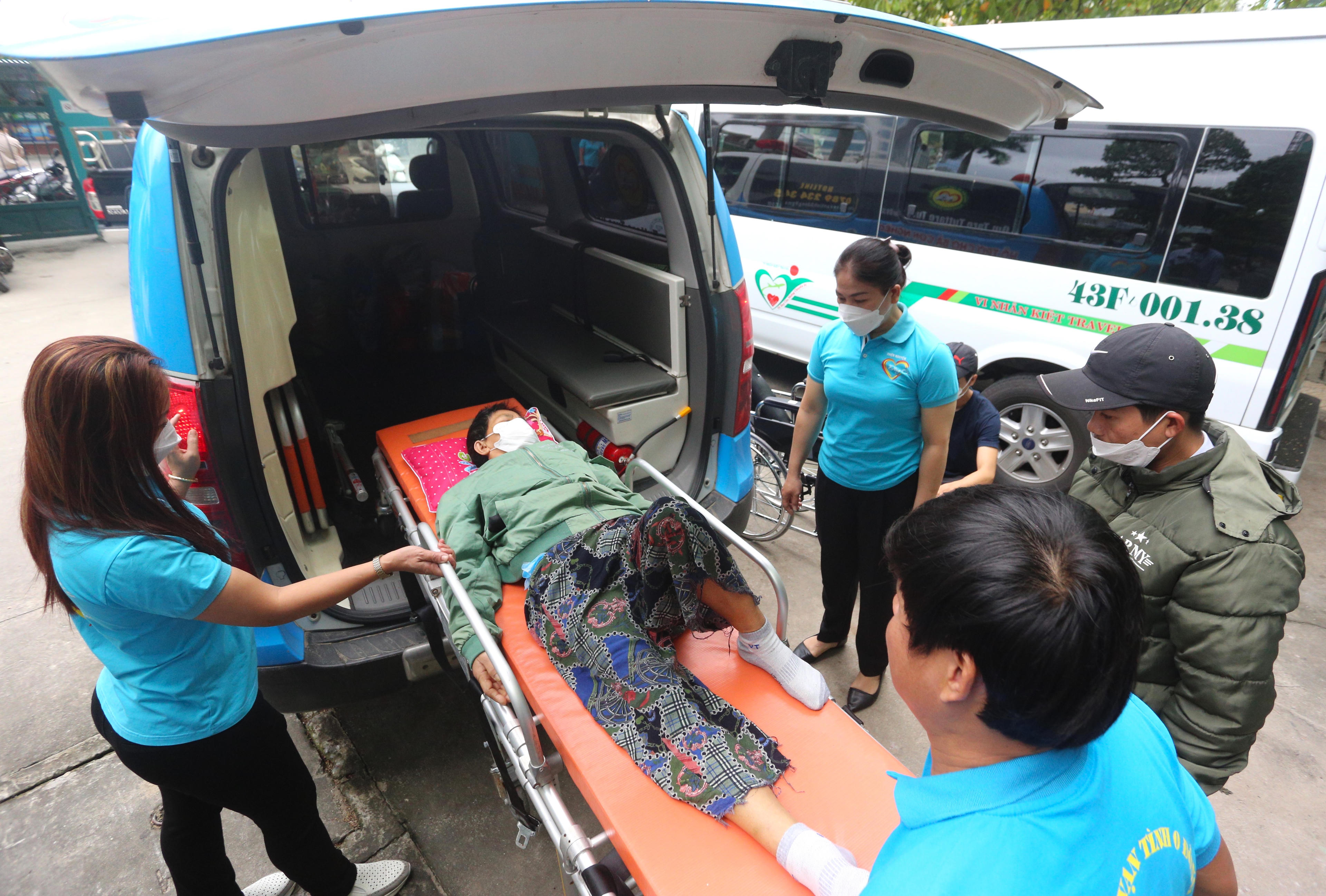 Nhân viên y tế của Bệnh viện Đà Nẵng hỗ trợ đưa các bệnh nhân lên chuyến xe nghĩa tình. |