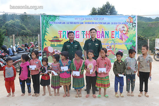 Đại diện Đồn Biên phòng Nậm Lạnh tặng quà cho học sinh điểm trường Hua Lạnh vươn lên trong học tập. Ảnh: Báo Sơn La.