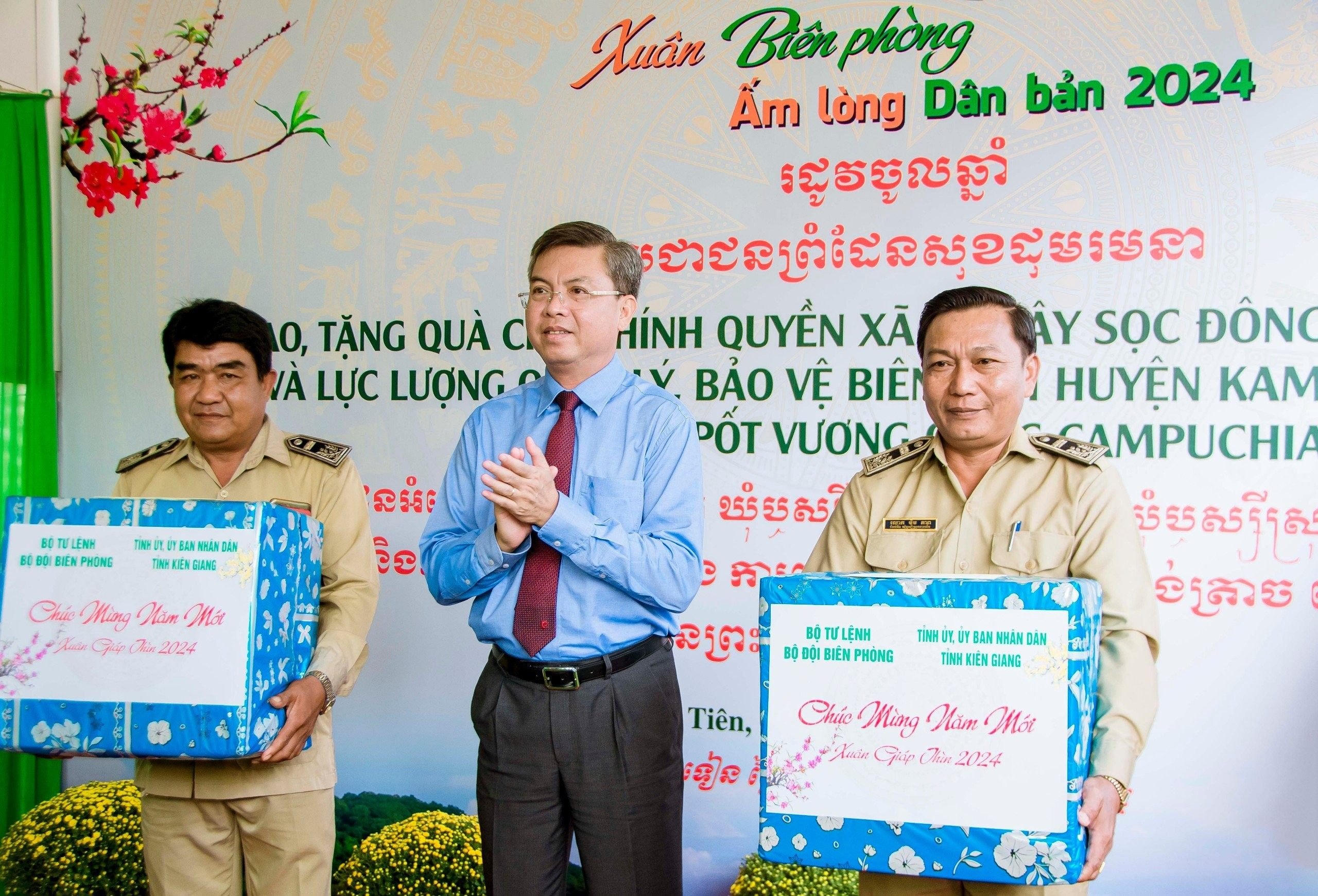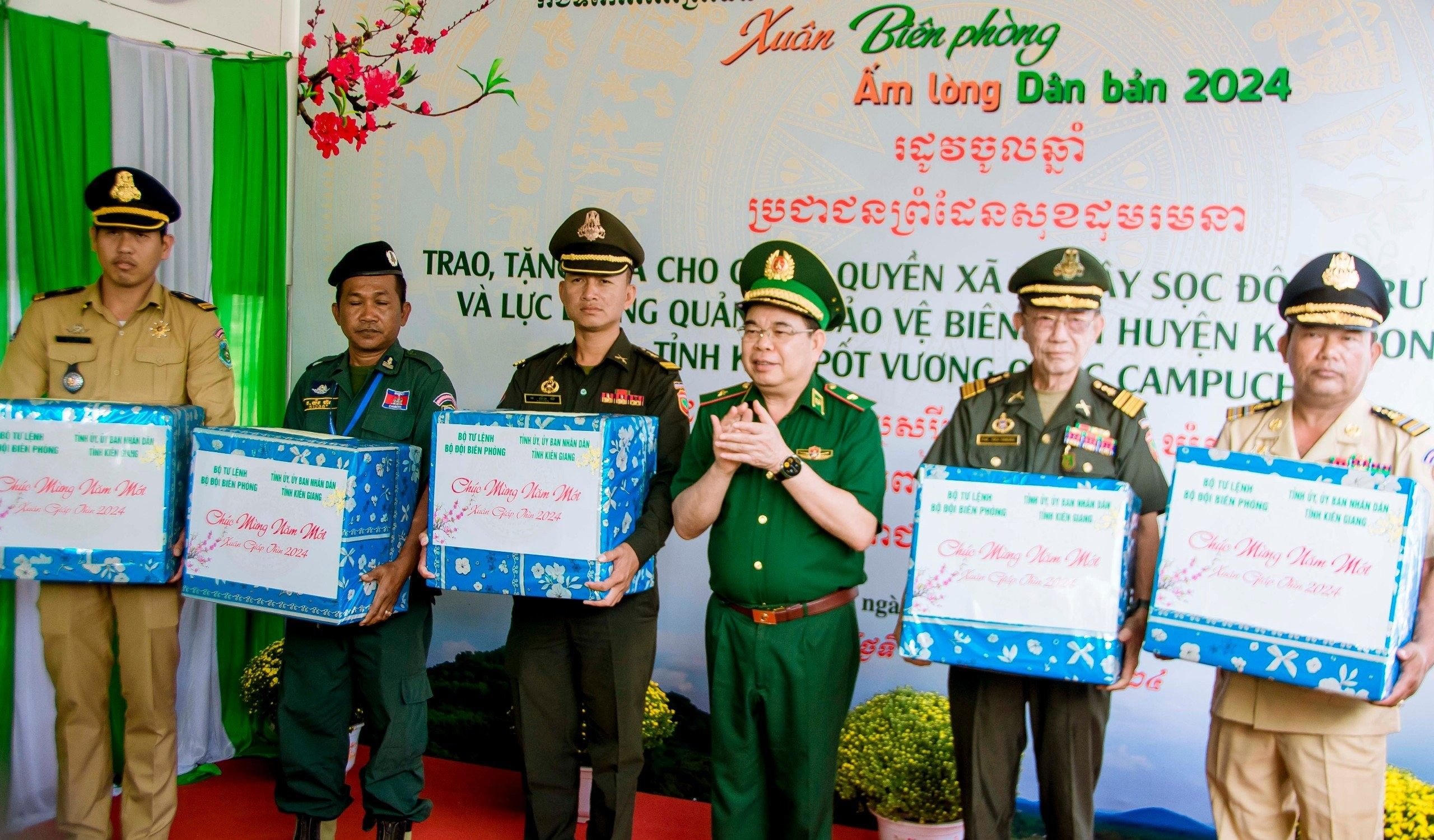 Phát biểu tại buổi trao quà, Đại tá Sea Sokha - Đội trưởng Đội Công tác biên giới Campuchia - Việt Nam, Phòng Công tác biên giới, Cục Lục Quân thay mặt các đơn vị chân thành cảm ơn Bộ Tư lệnh Bộ đội Biên phòng Việt Nam và UBND tỉnh Kiên Giang đã đến tặng quà trong Chương trình “Xuân biên phòng ấm lòng dân bản” năm 2024.