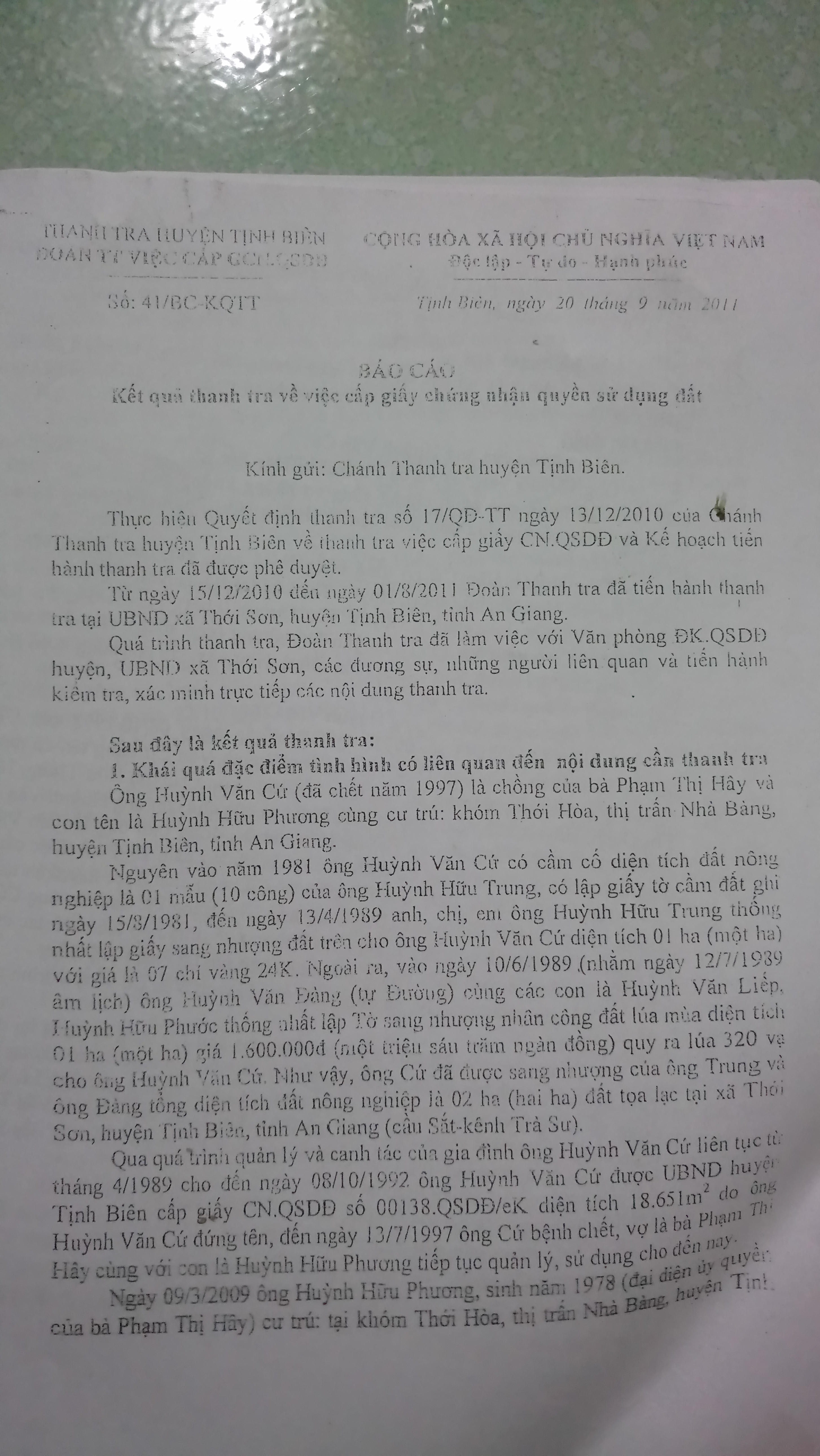 Theo đó, vợ chồng ông Huỳnh Văn Cứ và bà Phạm Thị Hây (trước ở xã Thới Sơn, giờ là thị trấn Nhà Bàng, huyện Tịnh Biên, An Giang) có nhận chuyển nhượng 1ha đất của ông Huỳnh Hữu Trung với số vàng là 7 chỉ vàng 24K; sau đó lại mua thêm 1ha đất của ông Huỳnh Văn Đàng với giá 1.600.000 đồng (trị giá 320 giá lúa lúc đó).