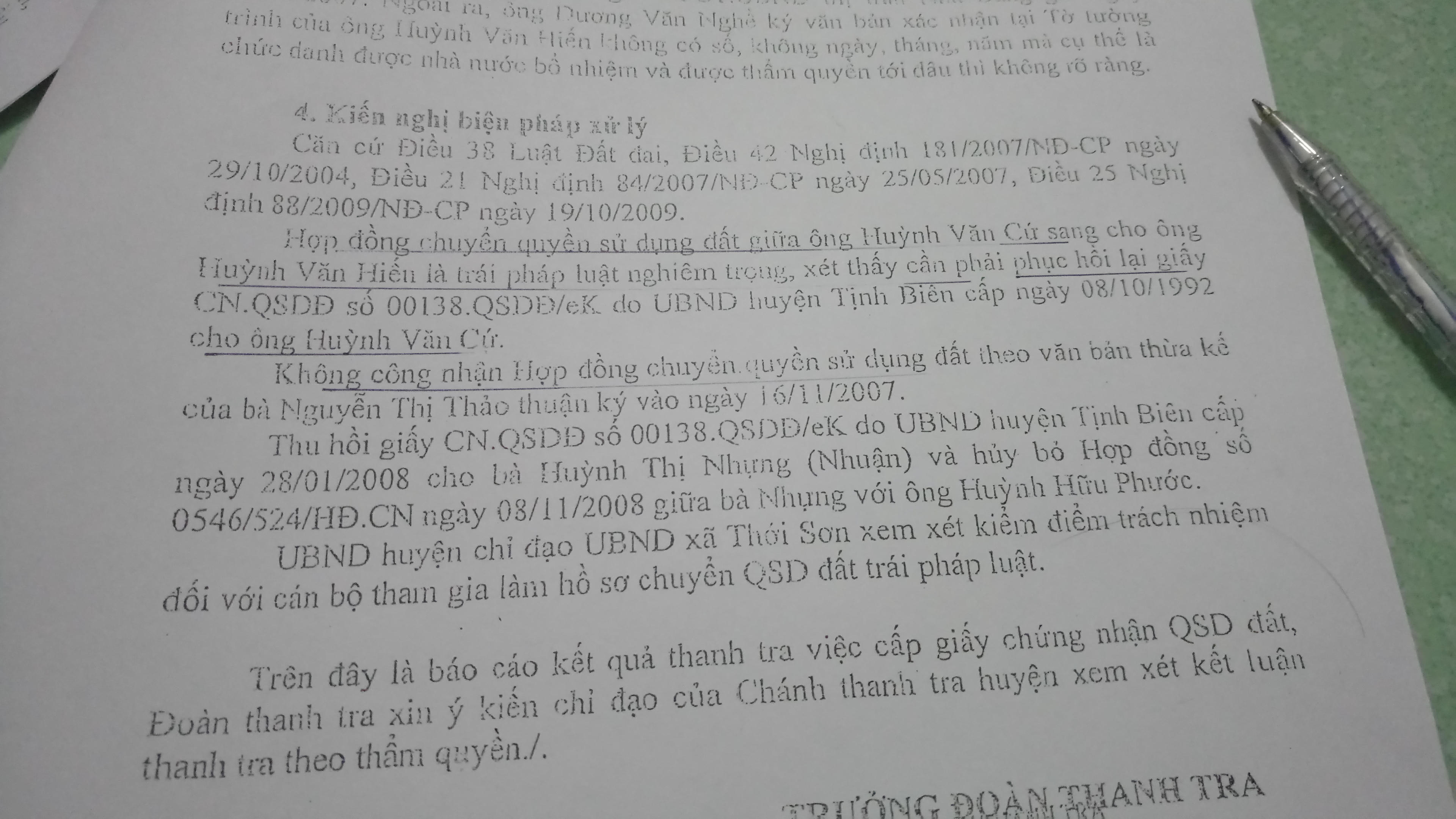 Không đồng tình, gia đình anh Phương khiếu nại lên UBND huyện Tịnh Biên. Sau đó, Thanh tra huyện đã vào cuộc và có kết luận số 41 ngày 20/9/2011 khẳng định: