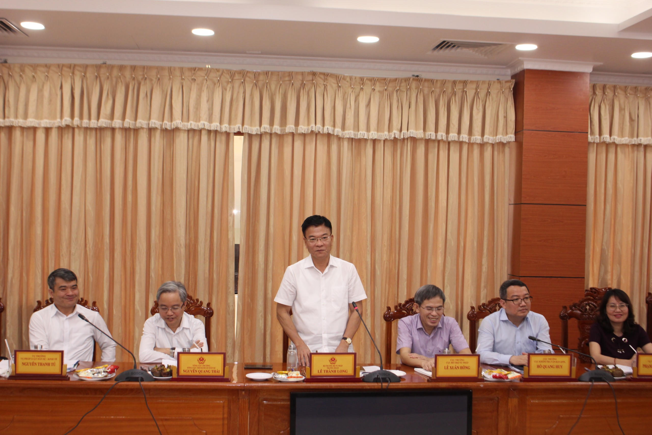 Phát biểu tại buổi làm việc, Bộ trưởng Bộ Tư pháp Lê Thành Long chúc mừng những thành tựu của tỉnh An Giang trong quá trình phát triển kinh tế, xã hội, bảo đảm quốc phòng, an ninh và mong rằng An Giang tiếp tục phát huy những thành tựu đã đạt được, đóng góp chung cho đất nước.