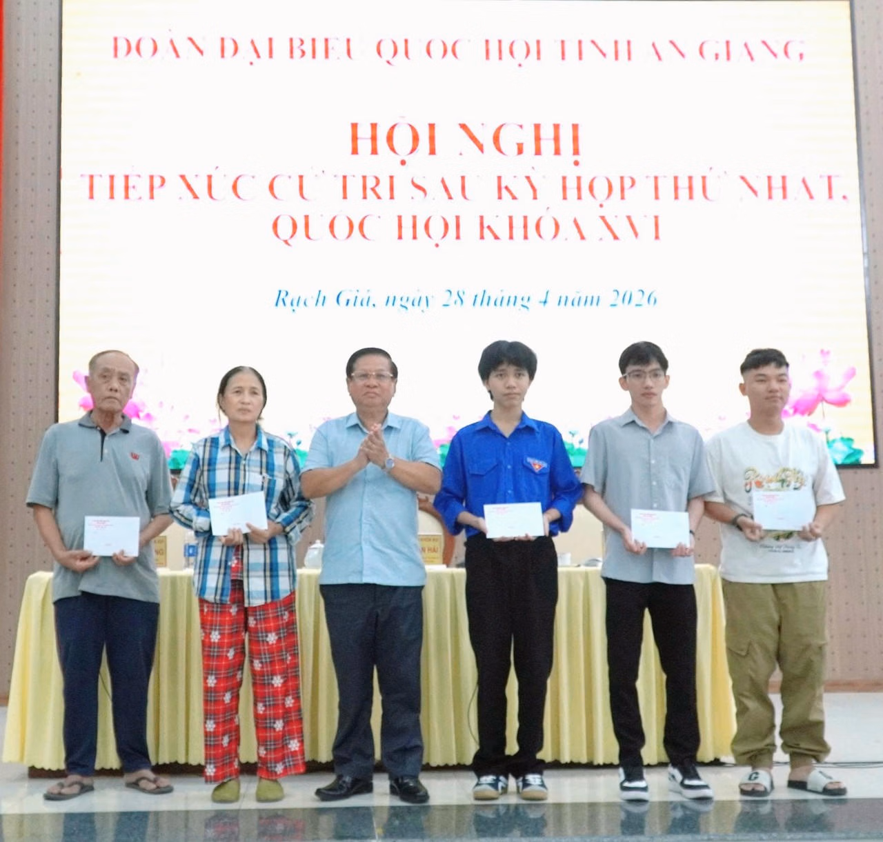 (PLVN) - Chiều 28/4, tỉnh An Giang tổ chức Hội nghị tiếp xúc cử tri sau Kỳ họp thứ Nhất, Quốc hội khóa XVI tại phường Rạch Giá. Ông Nguyễn Tiến Hải, Bí thư Tỉnh ủy, Trưởng Đoàn đại biểu Quốc hội tỉnh chủ trì.
