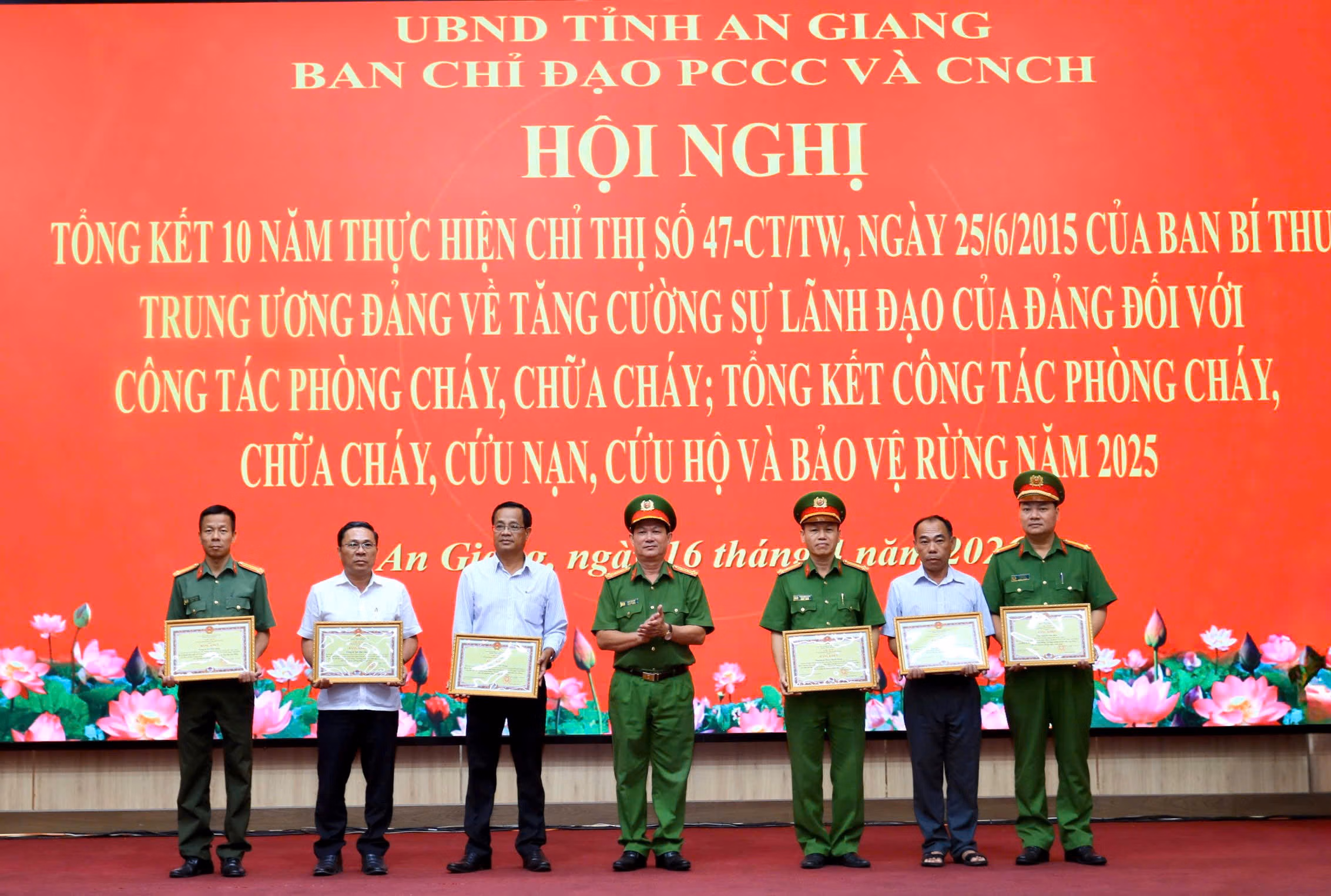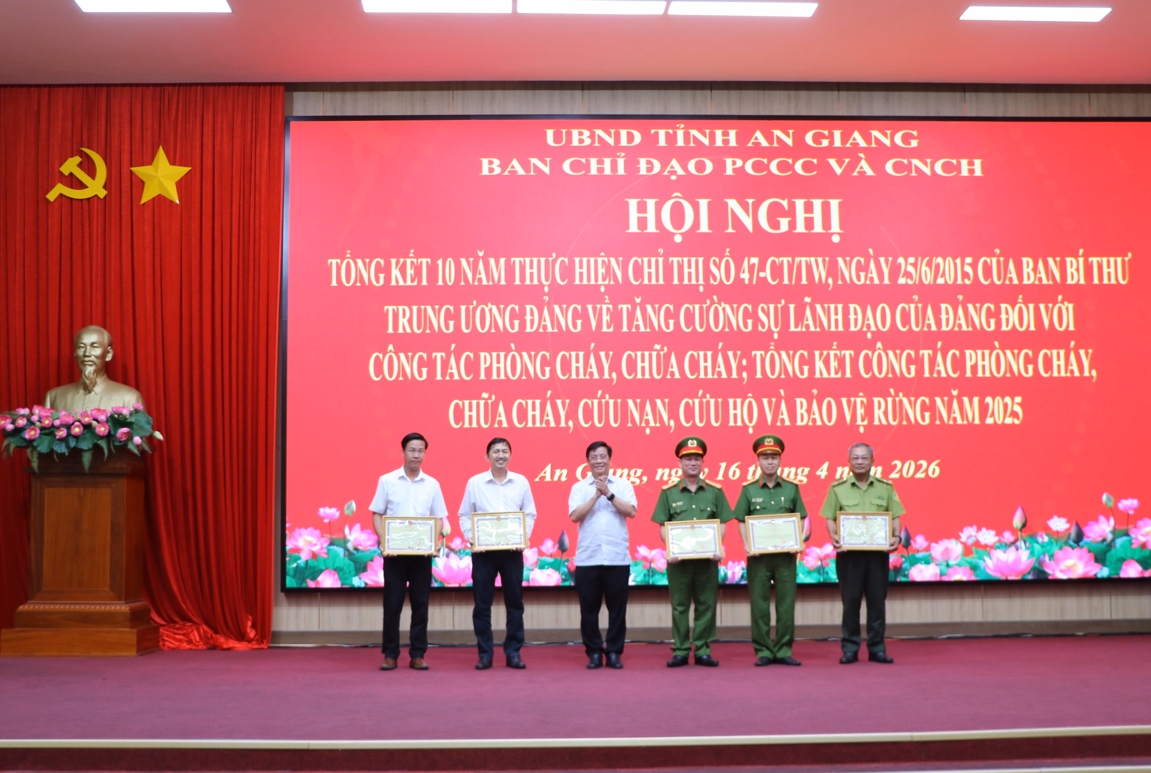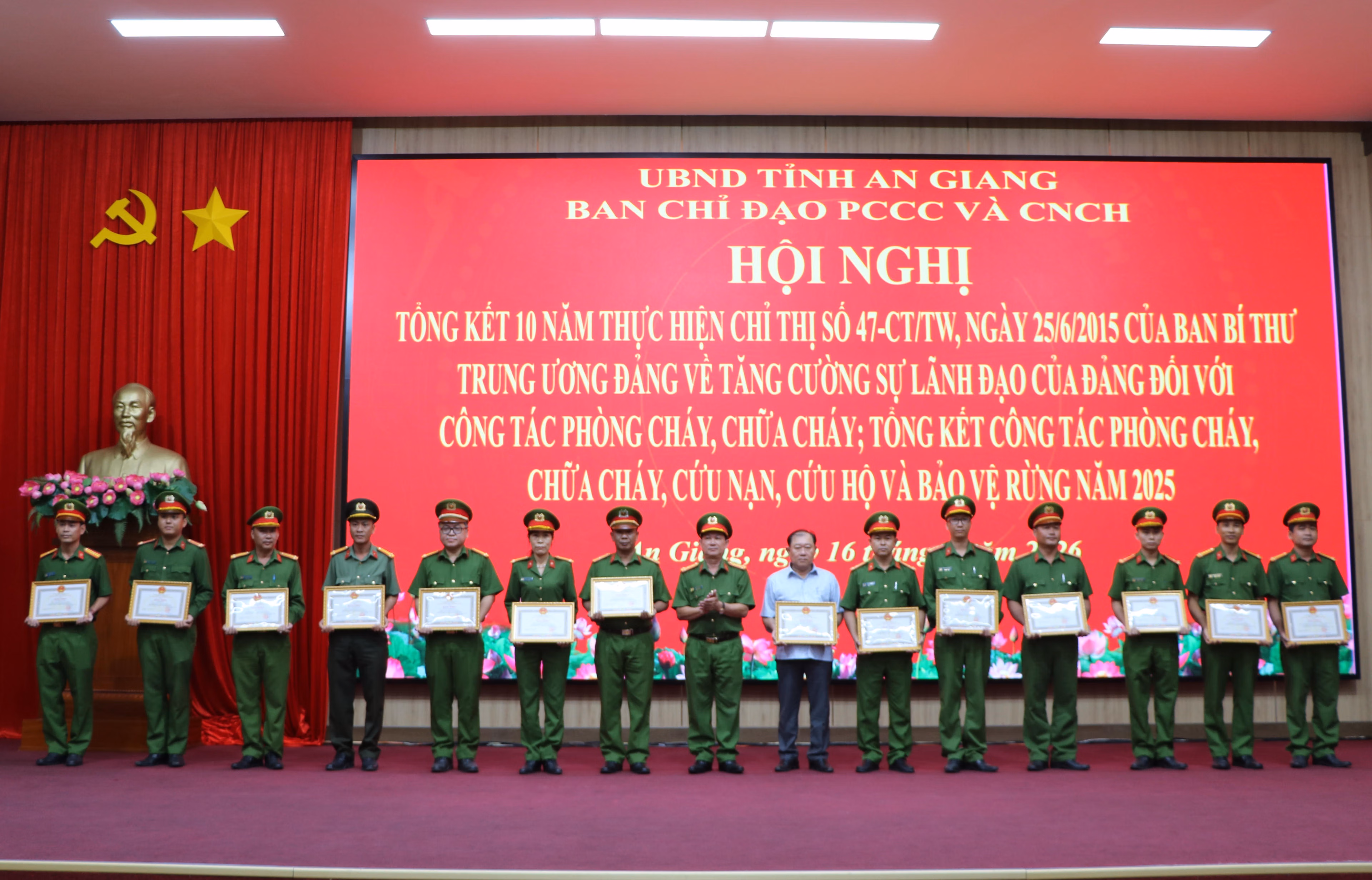 (PLVN) - Chiều 16/4, Ban Chỉ đạo phòng cháy, chữa cháy và cứu nạn, cứu hộ (PCCC và CNCH) tỉnh An Giang tổ chức tổng kết 10 năm thực hiện Chỉ thị số 47-CT/TW ngày 25/6/2015 của Ban Bí thư Trung ương Đảng về tăng cường sự lãnh đạo của Đảng đối với công tác PCCC; đồng thời tổng kết công tác PCCC và CNCH, bảo vệ rừng năm 2025, triển khai nhiệm vụ năm 2026.