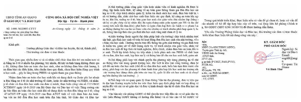 (PLVN) - Ngày 23/8, Sở Giáo dục và Đào tạo (GD&ĐT) tỉnh An Giang đã ban hành Công văn số 1489 gửi Trưởng Phòng GD&ĐT; thủ trưởng các đơn vị trực thuộc yêu cầu thực hiện một số nội dung nhằm đảm bảo an toàn cho học sinh khi được đưa rước bằng xe ô tô đến trường trên địa bàn.