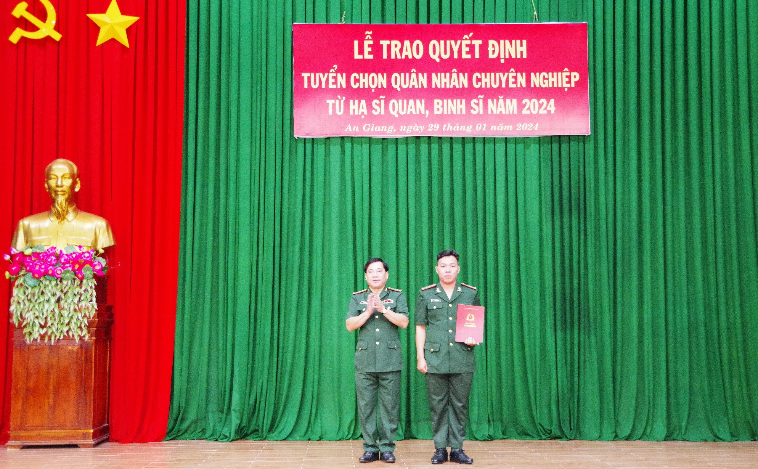 Thượng tá Nguyễn Văn Hiệp Bí thư Đảng ủy - Chính ủy BĐBP tỉnh An Giang trao quyết định tuyển chọn Quân nhân chuyên nghiệp từ Hạ sĩ quan, Binh sĩ năm 2024. |
