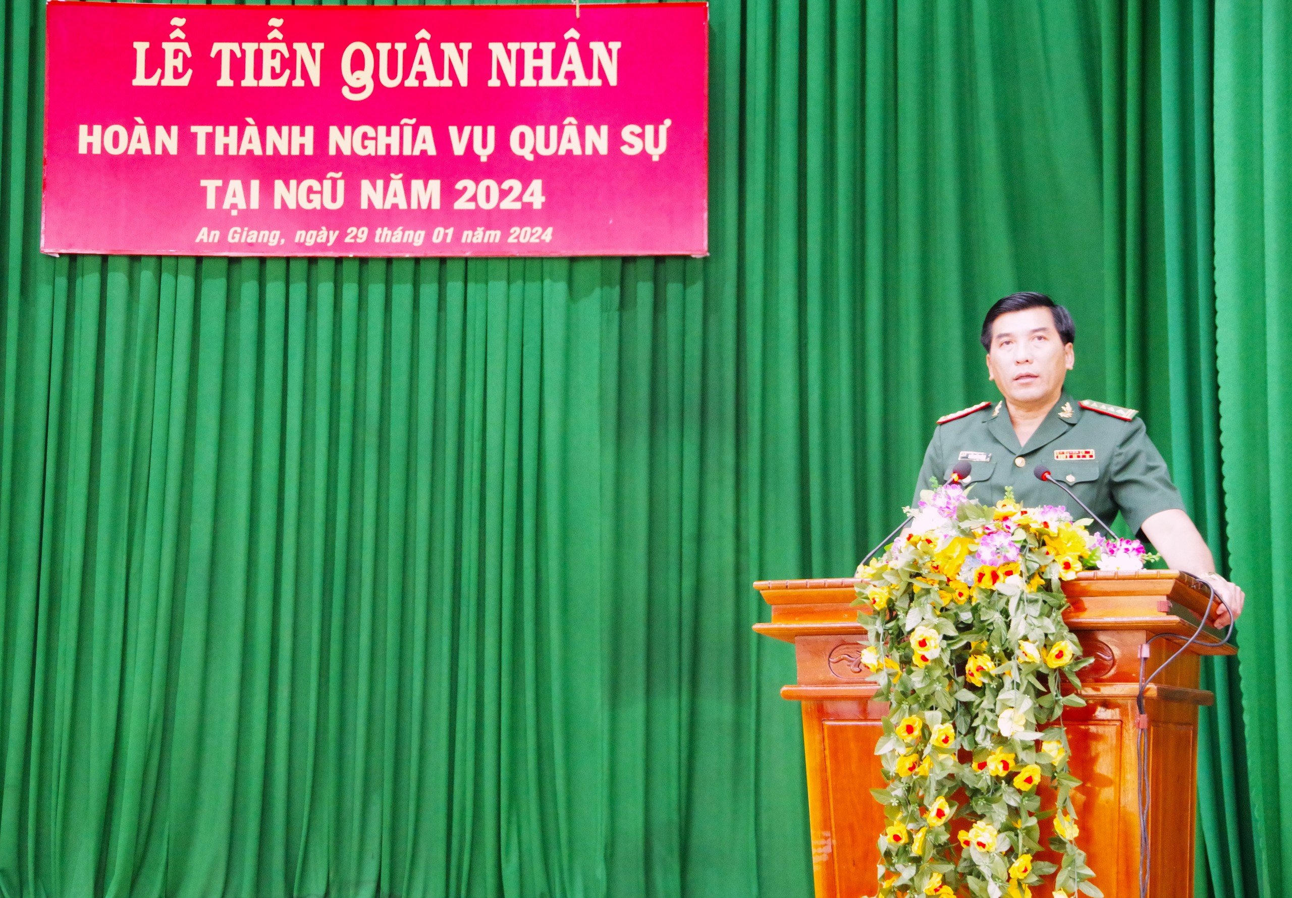 Đại tá Trần Quốc Khánh, Chỉ huy trưởng BĐBP tỉnh An Giang biểu dương và ghi nhận kết quả công tác của các đồng chí trong thời gian phục vụ tại ngũ, các đồng chí đã nổ lực, khắc phục khó khăn, hoàn thành tốt mọi nhiệm vụ được giao, đóng góp một phần tuổi trẻ của mình cho sự nghiệp xây dựng và bảo vệ chủ quyền lãnh thổ, an ninh biên giới quốc gia, mong muốn các chiến sĩ sau khi xuất ngũ tiếp tục phát huy phẩm chất tốt đẹp “Bộ đội Cụ Hồ”, bản lĩnh người quân nhân cách mạng, người lính “quân hàm xanh”, trở về địa phương tiếp tục cống hiến sức lực, trí tuệ để xây dựng quê hương, đất nước ngày càng giàu mạnh.
