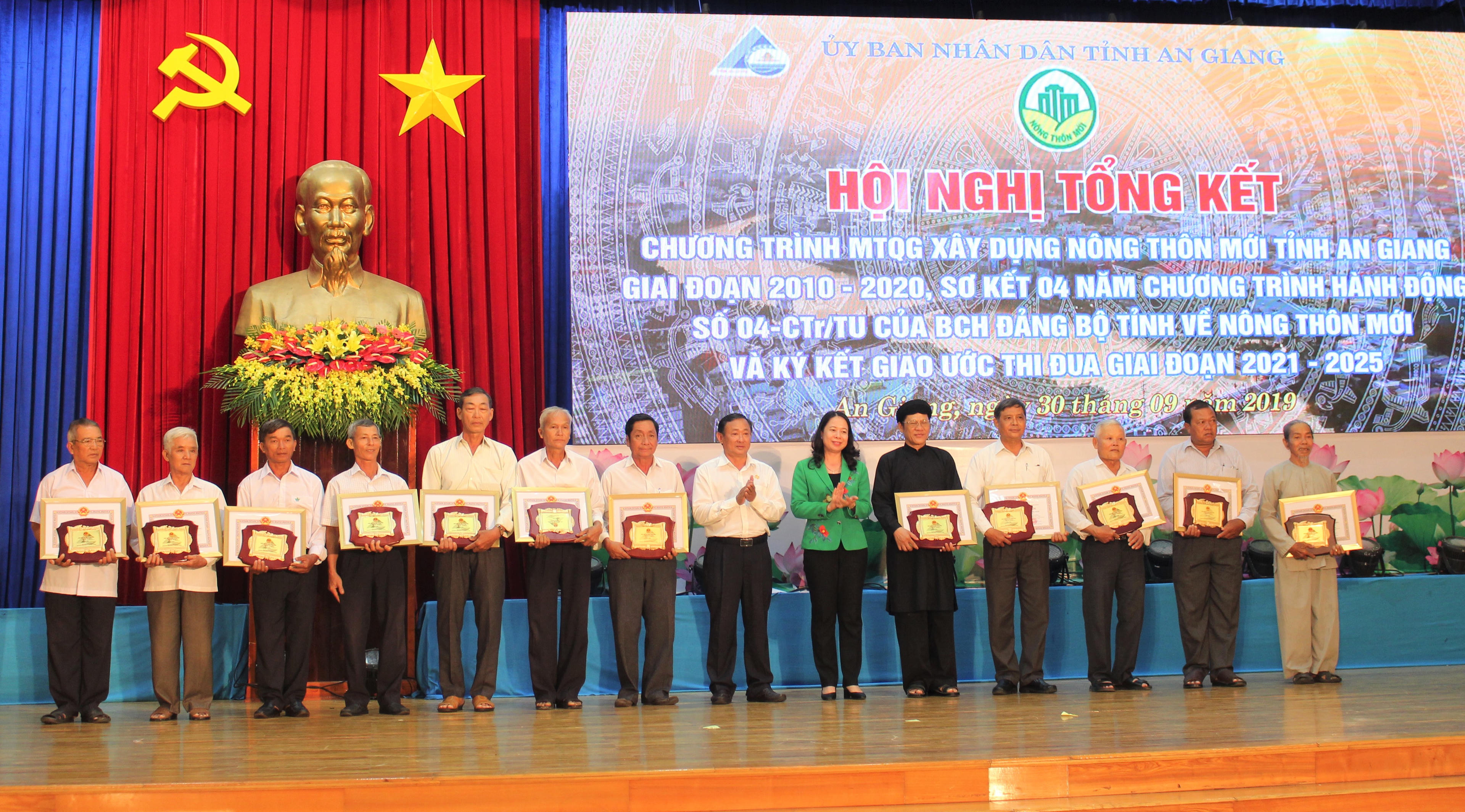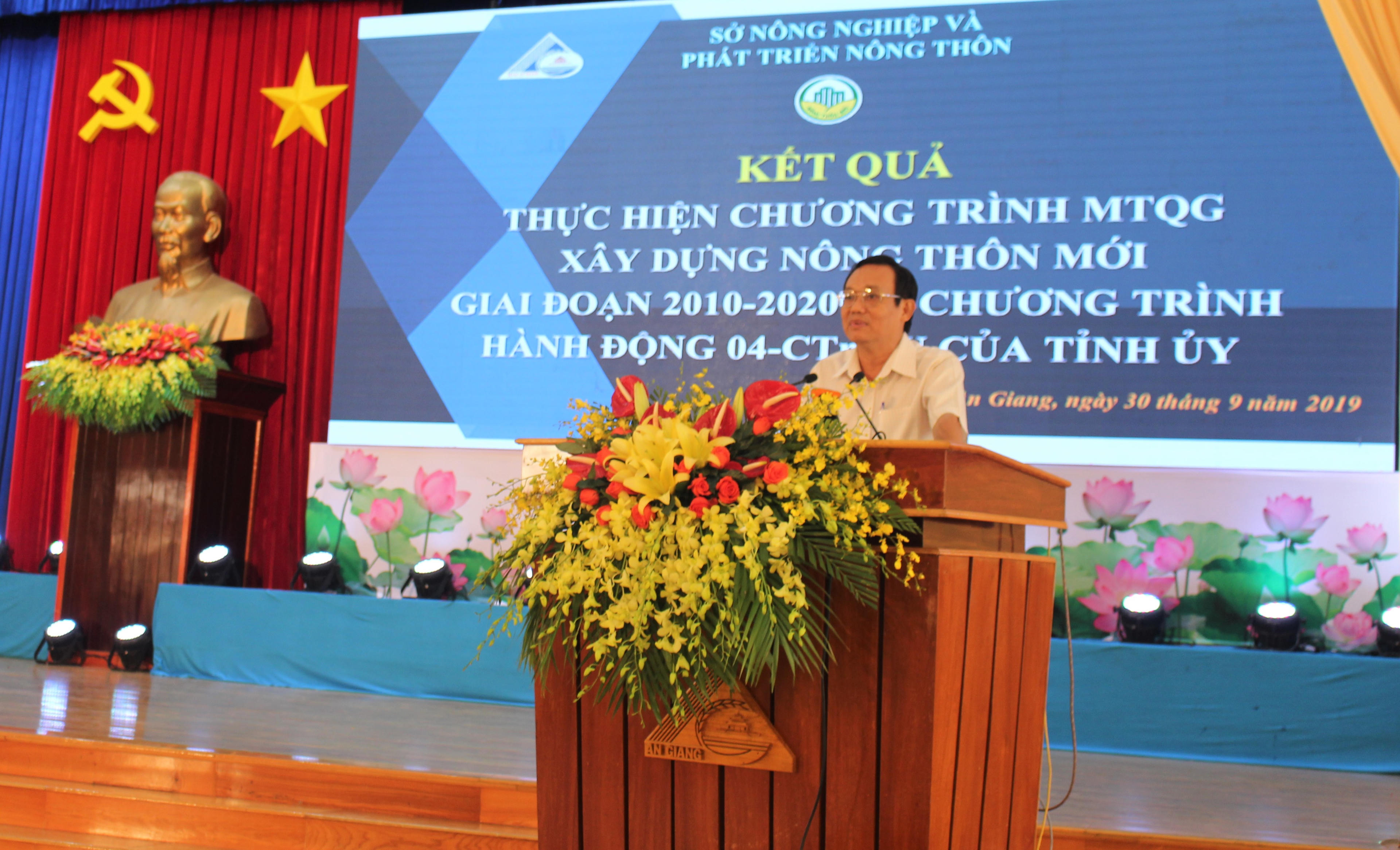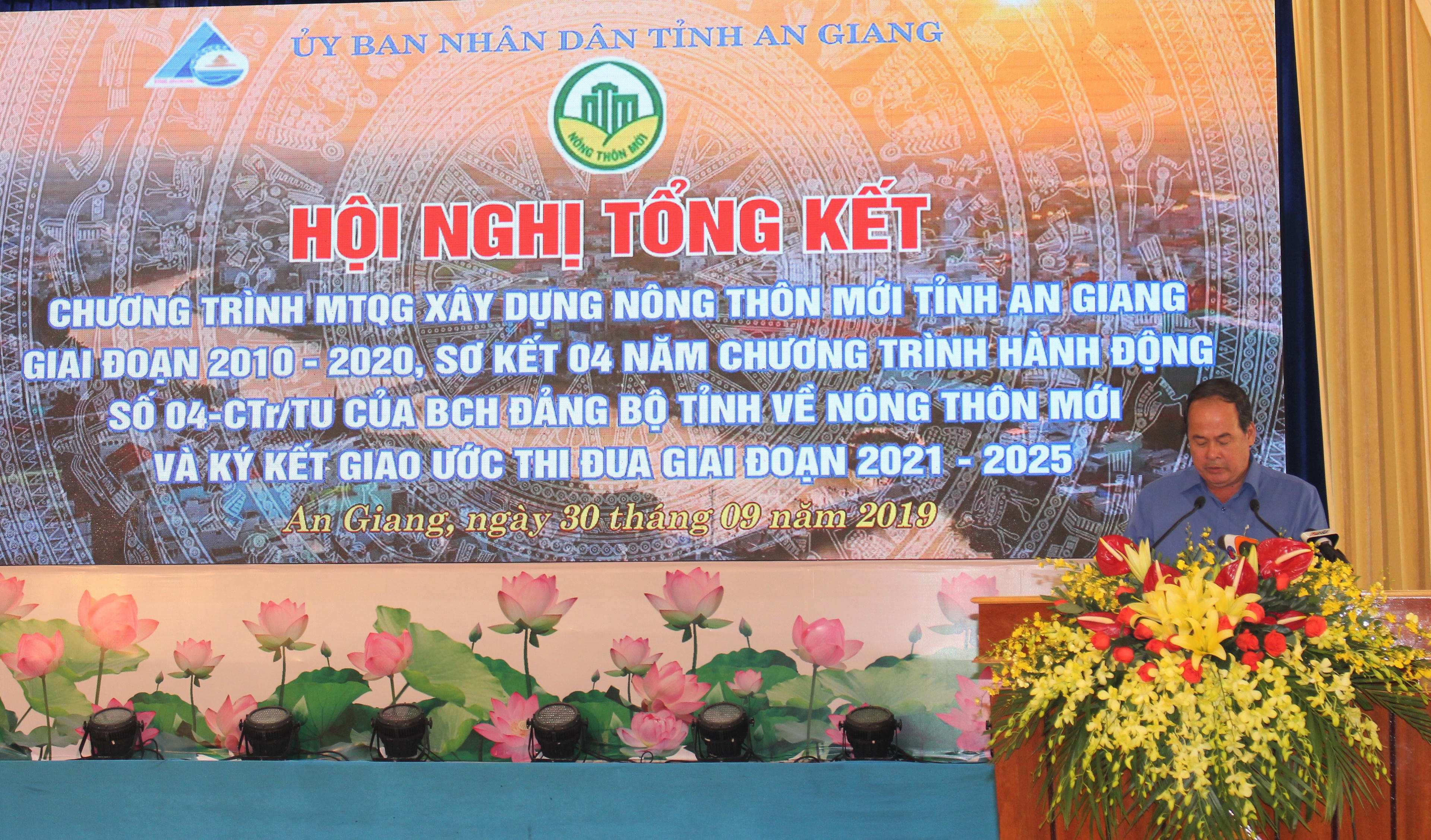 Phó Bí thư Tỉnh ủy, Chủ tịch UBND tỉnh An GIang Nguyễn Thanh Bình cho biết: “Sau gần 10 năm thực hiện Chương trình mục tiêu quốc gia xây dựng NTM, nhờ sự nỗ lực và sự chung sức, chung lòng của toàn Đảng bộ, chính quyền và nhân dân tỉnh nhà; đến nay tỉnh đã đạt được những kết quả rất quan trọng. Tỉnh có 54 xã đạt chuẩn NTM và ước đến cuối năm 2019 sẽ có 61/119 xã đạt chuẩn xã NTM, đạt tỷ lệ 51,26% tổng số xã. Với kết quả này, tỉnh đã hoàn thành mục tiêu của Chương trình sớm hơn 01 năm so với lộ trình, kế hoạch của Ban Chấp hành Đảng bộ tỉnh đề ra từ đầu nhiệm kỳ. Tỉnh đã có 03 đơn vị cấp huyện hoàn thành Chương trình mục tiêu quốc gia xây dựng NTM gồm: TP Long Xuyên, TP Châu Đốc và huyện Thoại Sơn.