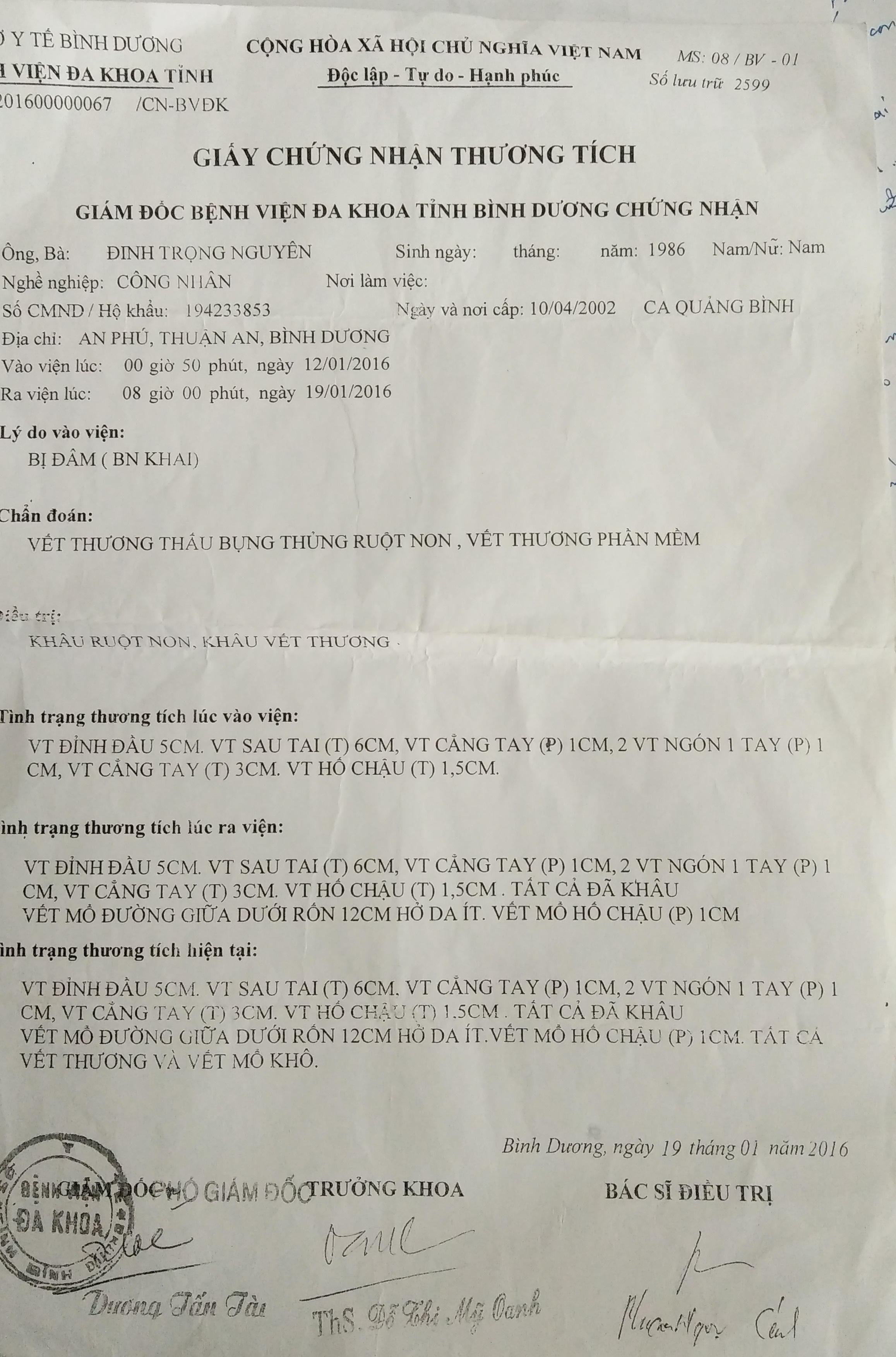Khoảng 1 tháng sau khi sự việc xảy ra, anh Nguyên có đơn yêu cầu khởi tố đến công an TX Thuận An. Không hiểu tại sao, hai tháng sau khi nhận đơn, công an TX Thuận An mới đưa bị hại đi giám định thương tích. Anh Nguyên hỏi thì được trả lời thương tích của mình là 31%. Đến 3 tháng sau, công an TX Thuận An mới ra quyết định khởi tố vụ án “cố ý gây thương tích”.