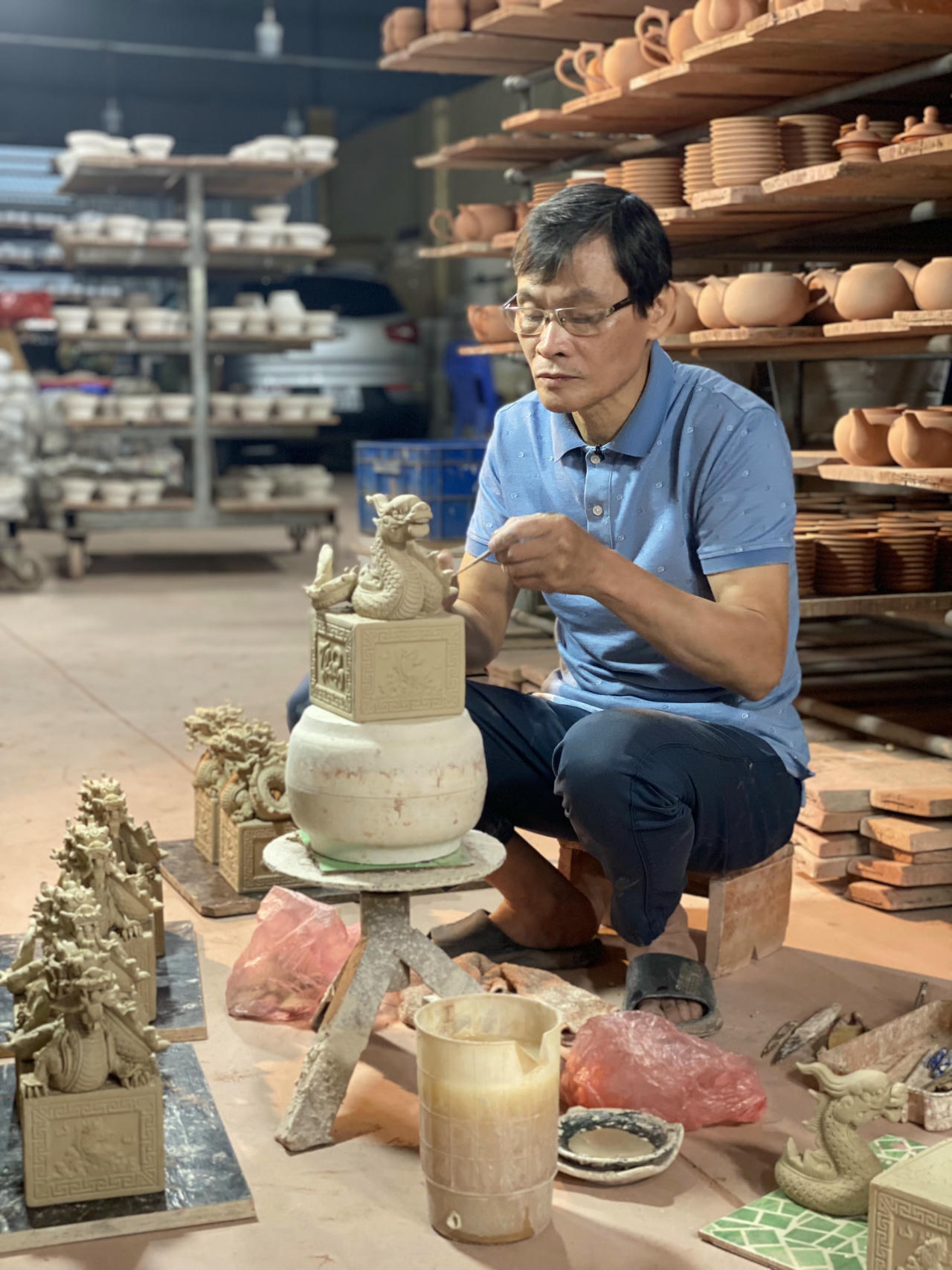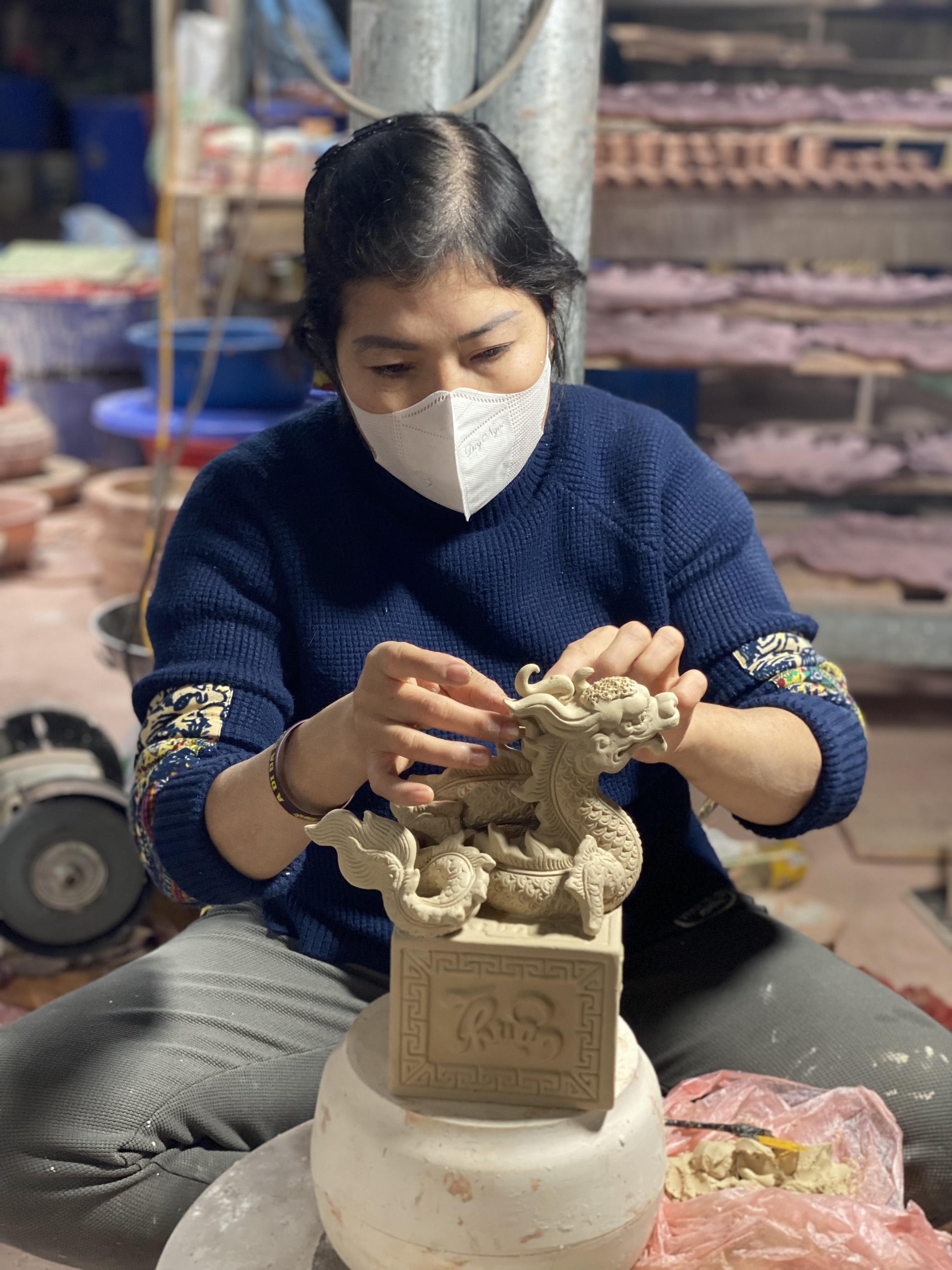 Hơn 10 năm làm nghề tại Bát Tràng, chị Đào Thị Yến cho biết: "Công đoạn đắp các chi tiết nhỏ cho sản phẩm như râu, vây lưng được thực hiện bằng tay. Những chi tiết nhỏ đòi hỏi sự tỉ mỉ, tinh tế và uyển chuyển. Do nhận số lượng đơn hàng nhiều nên chúng tôi phải làm gấp đôi năng suất".