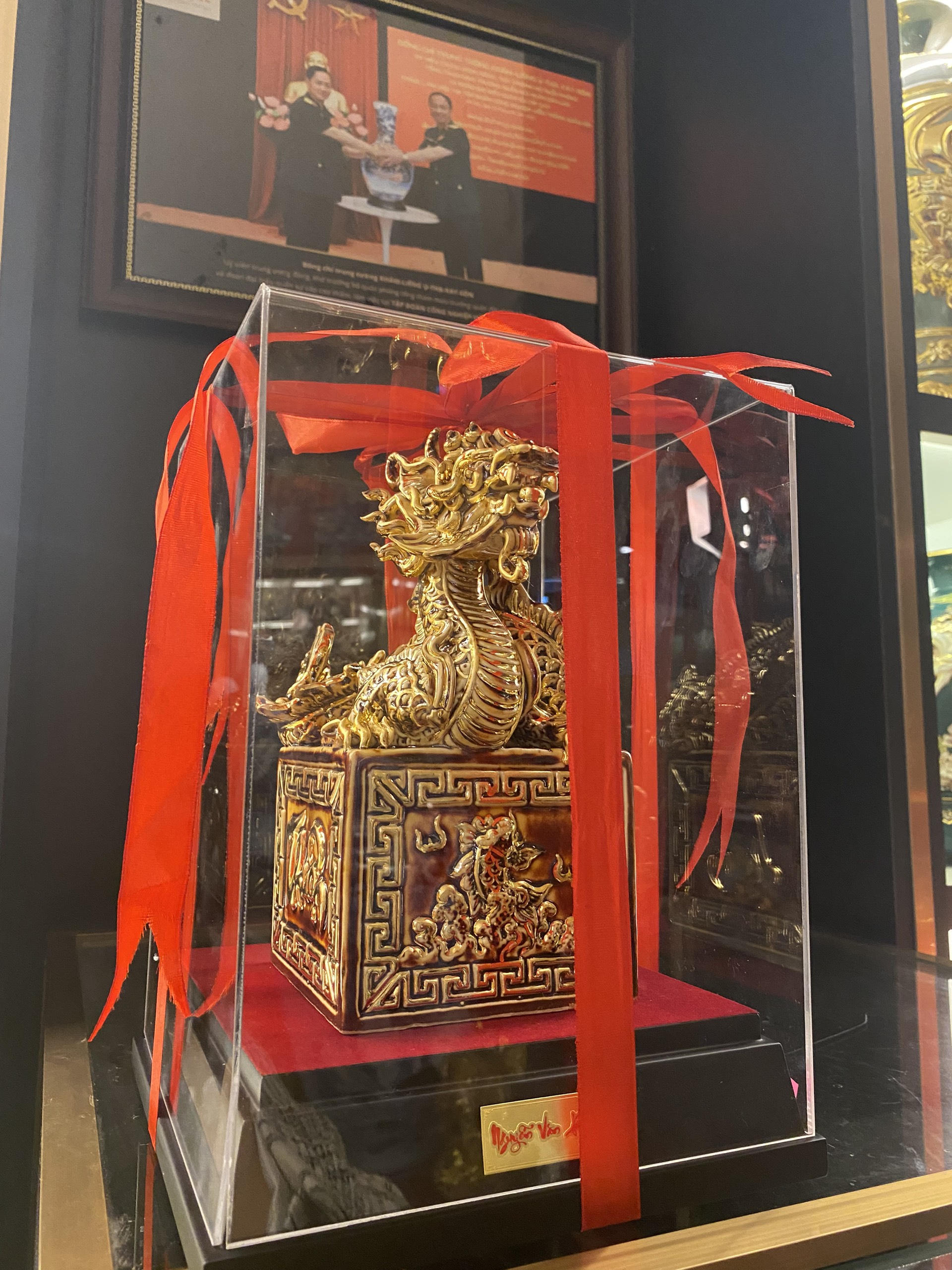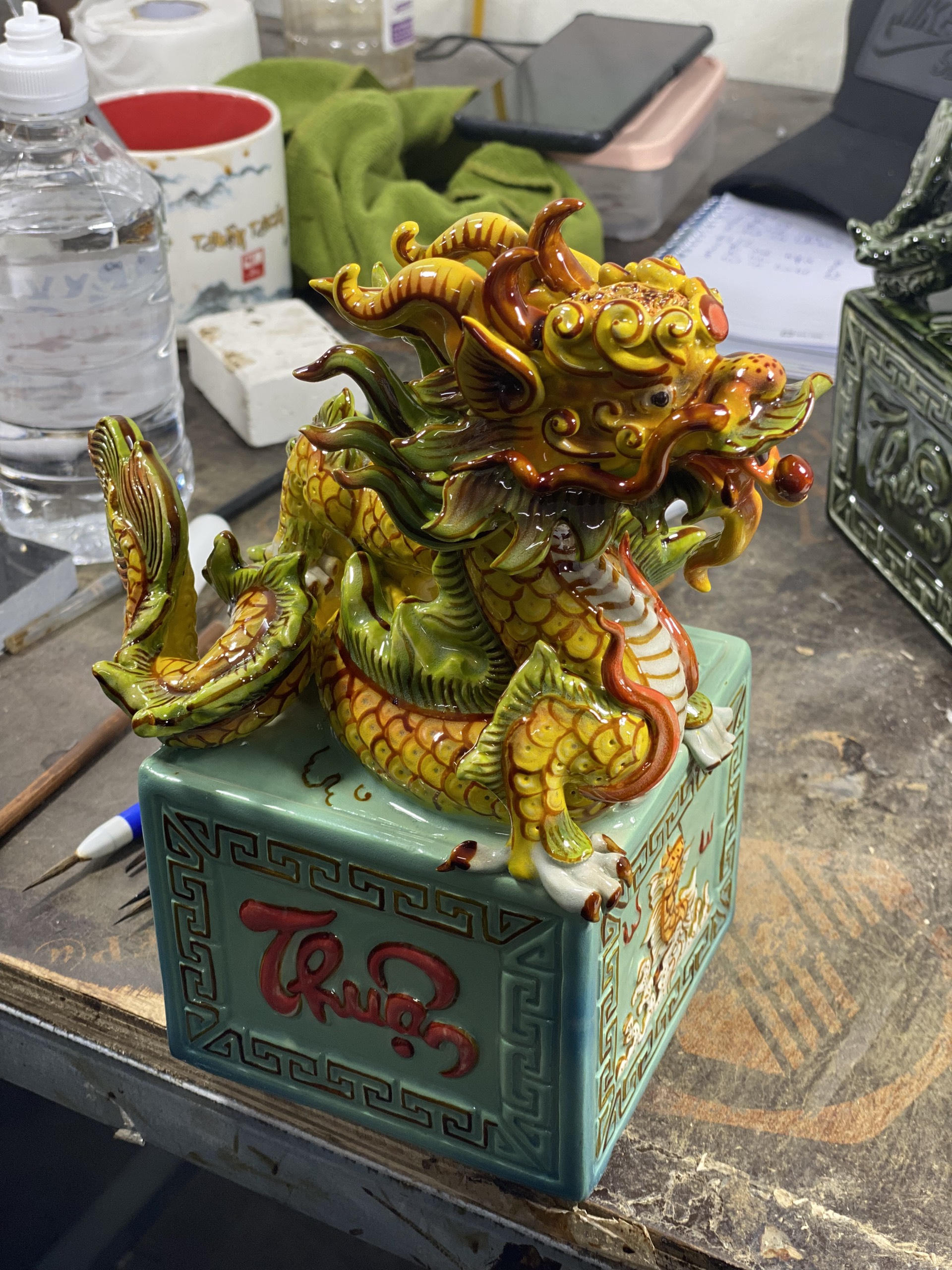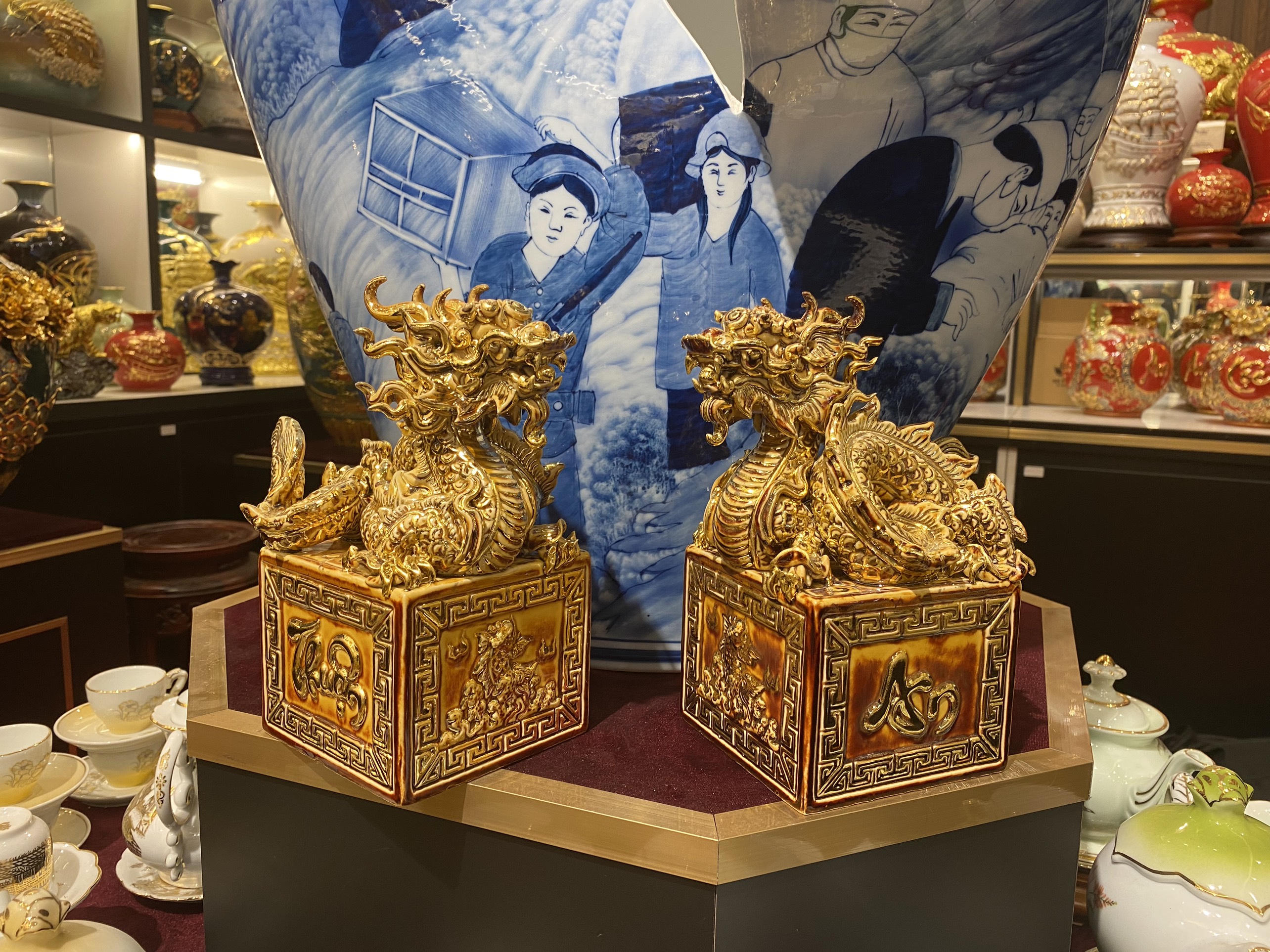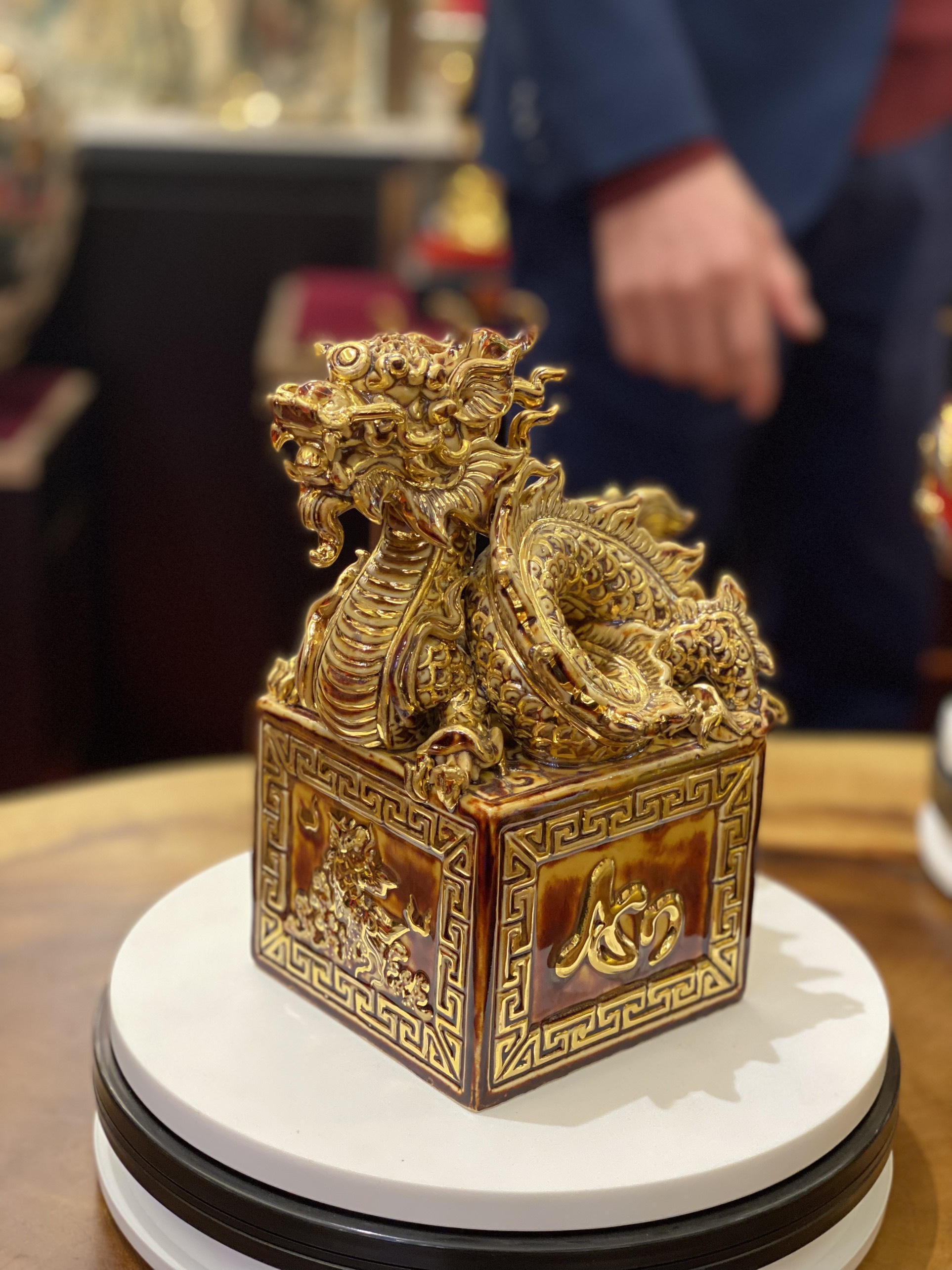 Ông Phạm Việt Khoa làng Bát Tràng, có thâm niên gần 40 năm làm nghề gốm sứ cho biết, năm nay, sản phẩm chính mà xưởng của ông làm chính là chiếc ấn rồng này. "Rồng tượng trưng cho sự uy nghi, thịnh vượng và may mắn. Sản phẩm được cách điệu theo hình mẫu Hoàng đế chi bảo từ thời vua Minh Mạng".