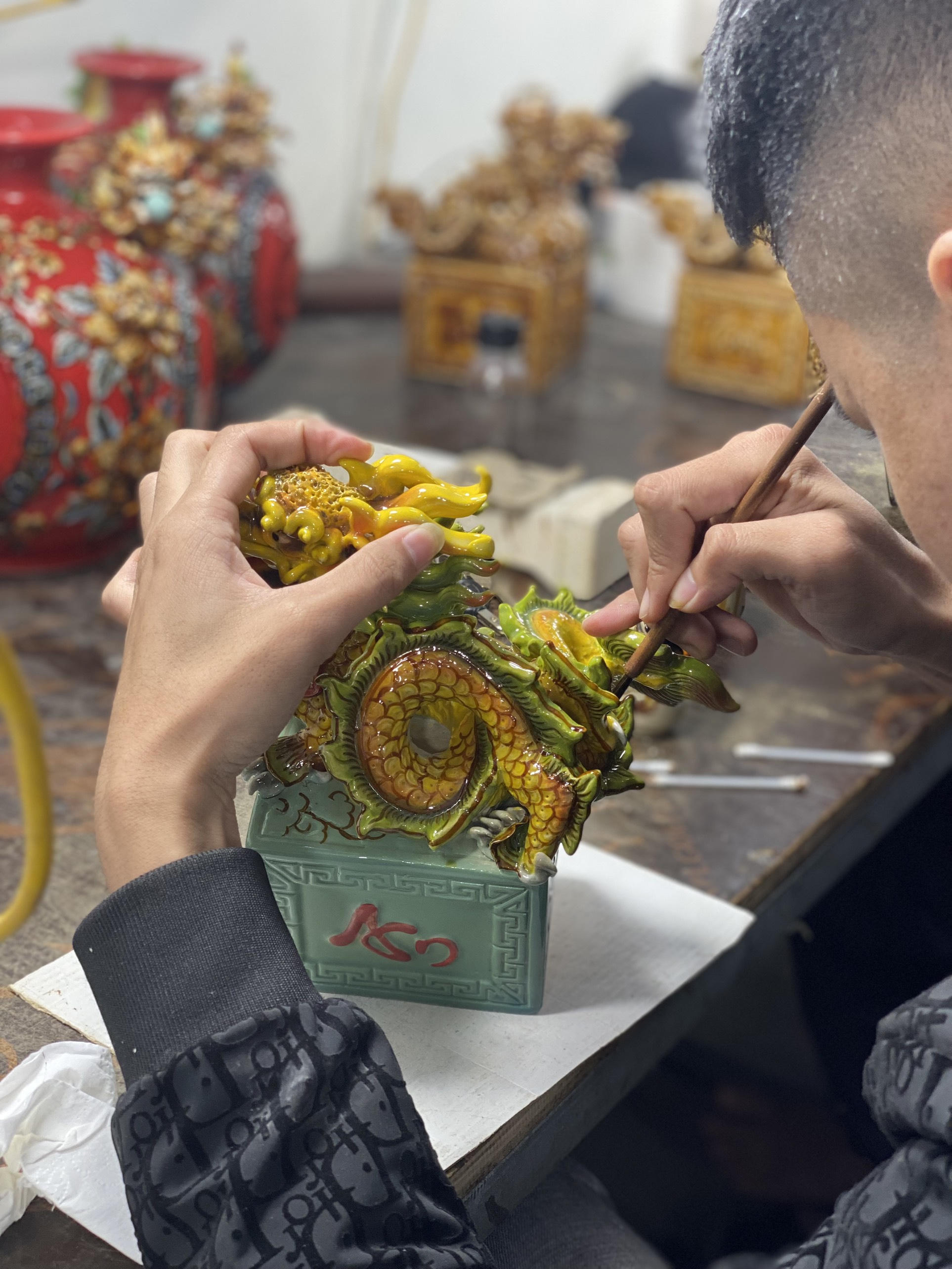 Người thợ sẽ dùng dung dịch vẽ vàng 24K để trang trí cho sản phẩm sau đó sẽ được mang đi nung lần 2 ở nhiệt độ phù hợp trong khoảng 6-8 tiếng để tạo nên lớp mạ vàng sang trọng.